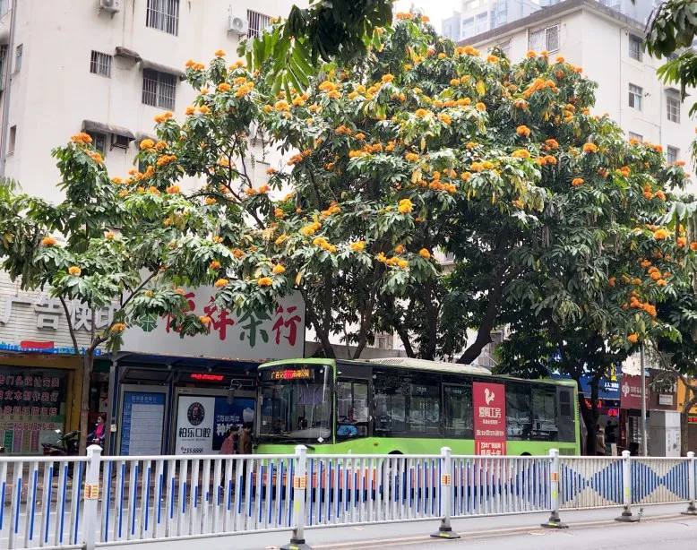 凤岭南青秀路口(青秀山北门)公交车站,三角梅缀满枝头,似把晚霞揉碎撒满护栏,玫红浅紫交织,层层苞片薄如蝉翼。微风拂过,花影轻摇,让等候公交车的时光也变得温柔诗意。在园湖建政路口公交车站,火焰花热烈绽放,金赤橙黄的花簇似一团团跳动的星火,褪去枝叶的羞怯,将一冬积蓄的热情尽情释放,明艳动人。园湖路上公交车站的火焰花。