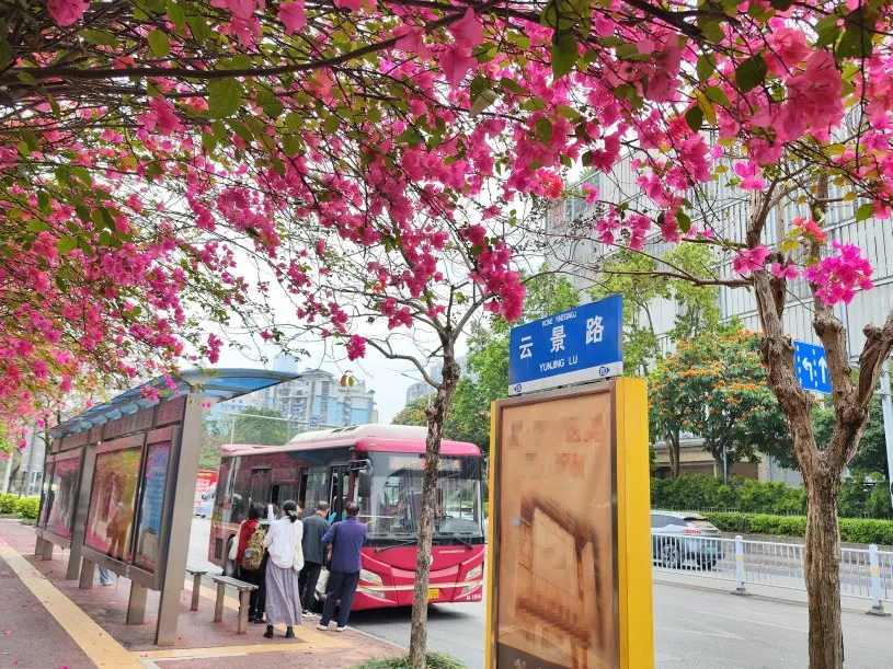春风拂过南宁,把浪漫藏进最寻常的烟火,在街头巷尾的角落悄然绽放。公交车站旁、停车场里,一簇簇繁花肆意绽放,被网友盛赞为“最美打卡地”,吸引市民赴一场与春天的温柔之约。凤岭南青秀路口(青秀山北门)公交车站。