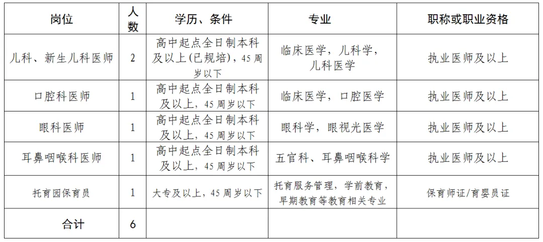 (二)法定待遇:劳动合同制专业技术人员(医师、保育员)按单位规定办理社保及公积金,均享受国家及地方法定节假日等。
