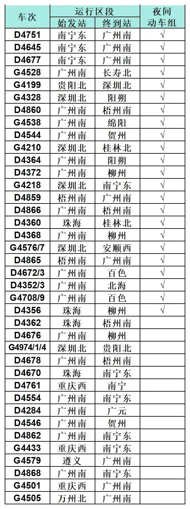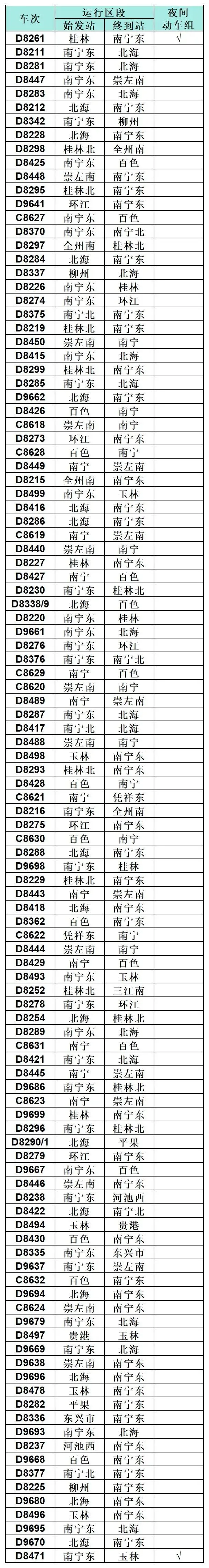清明假日运输期间动态开行的列车较多,请广大旅客及时关注车站公告或铁路12306网站信息,提前安排行程;暂未买到车票的旅客,可使用中国铁路12306网站、12306手机APP中的候补购票功能候补购票;国铁南宁局管内许多城市有两个及以上火车站,出行前务必确认乘车信息,勿因跑错车站耽误行程。