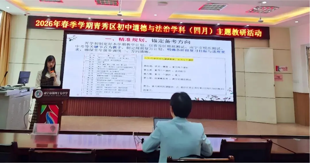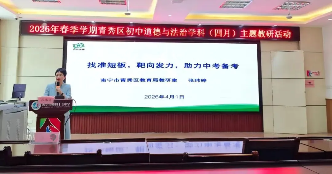青秀区初中道德与法治教研员张玮婷老师在备考指导环节作了题为《找准短板,靶向发力,助力中考备考》的专题讲座。张老师提出,备考应立足课标要求,梳理高频考点,找准学生的知识薄弱点与答题短板,坚持靶向发力、精准施策。