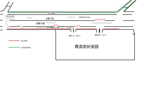 当园区内车位已满时,市民群众在不响影其它车辆通行情况下,按交警指定的临时停放点将车辆单排停放至龙堤路两侧及五象大道北侧辅道一侧。