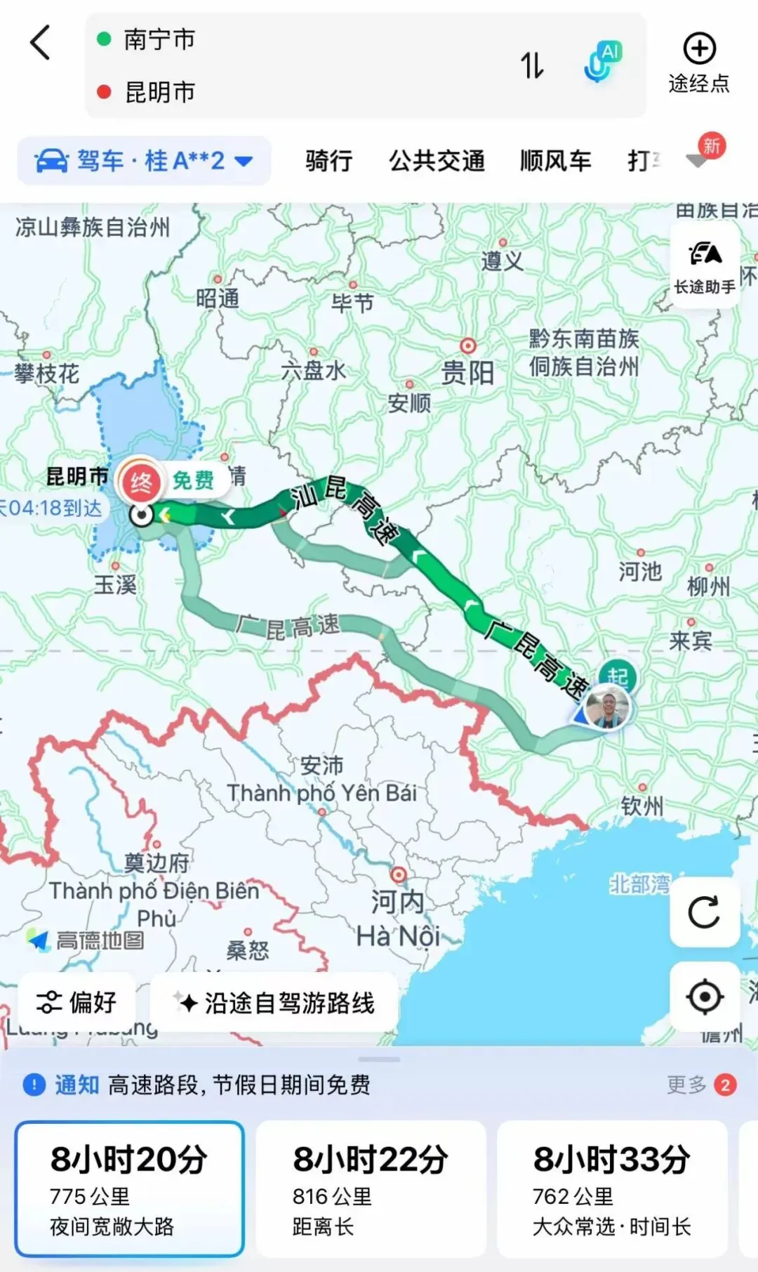 南宁到昆明,约760公里,广昆高速转汕昆高速。