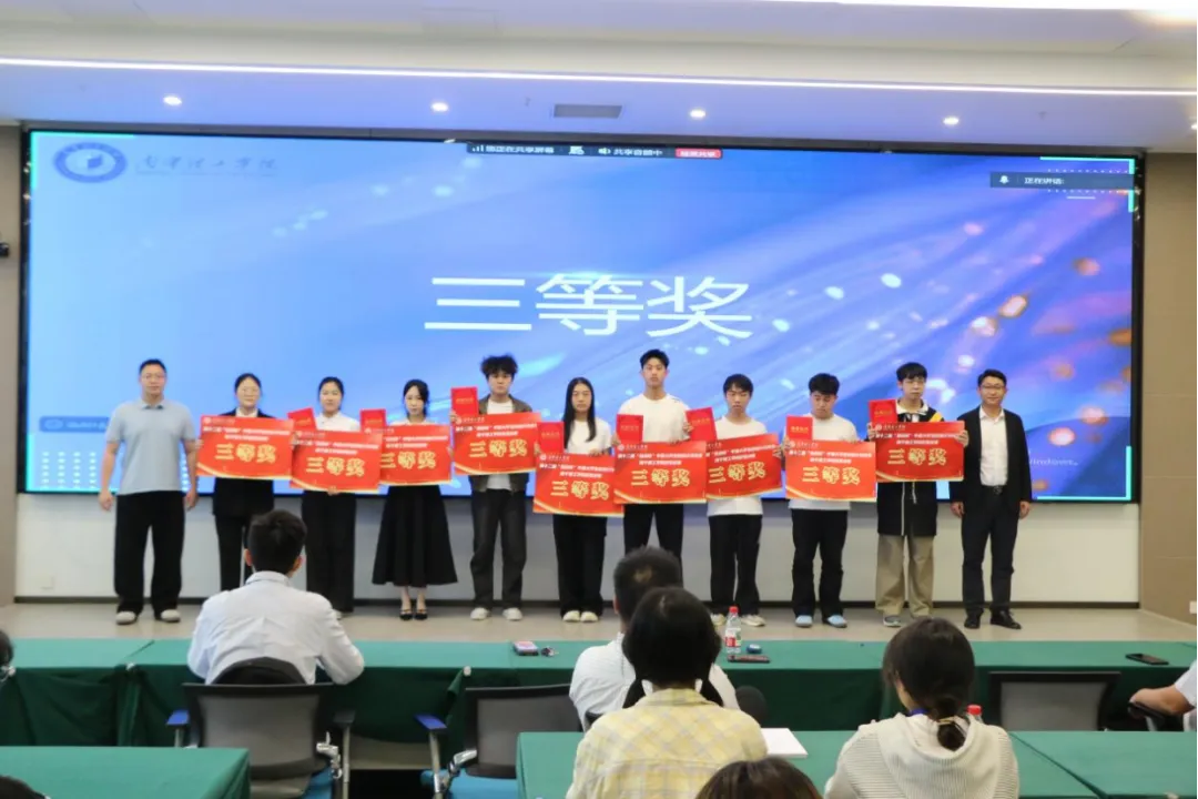 经过数小时的激烈角逐,评委团结合路演表现、答辩情况、项目综合实力进行现场打分,最终评选出一、二、三等奖。学校老师依次为各获奖团队代表颁发荣誉证书,现场掌声不断,氛围热烈而隆重,每一份荣誉都是对参赛团队创意与努力的最好肯定。颁奖仪式结束后,各位领导、评委老师与所有获奖团队代表共同合影留念,用镜头定格下这一难忘的科创时刻。