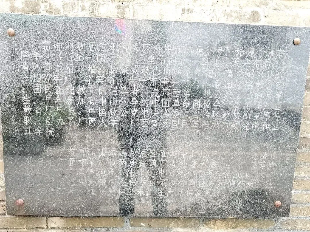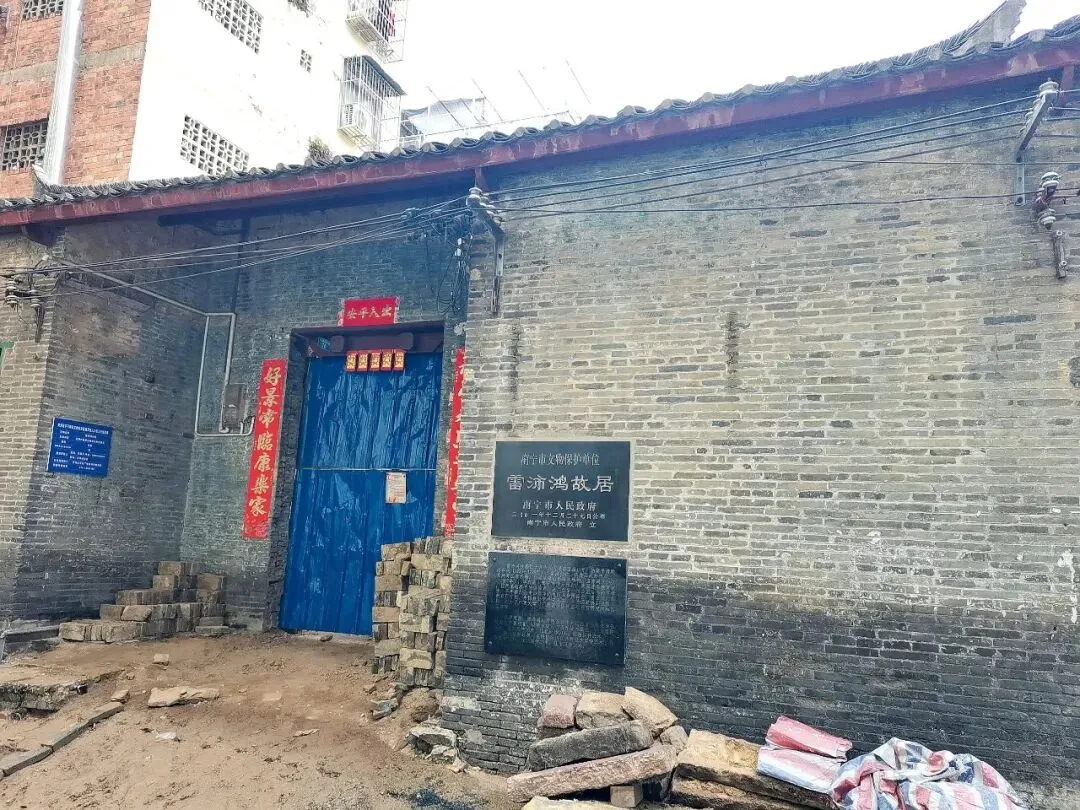 雷沛鸿故居坐落于南宁市青秀区河堤路雷屋16号。整座建筑始建于清代乾隆年间,坐南向北,青砖青瓦清水墙,为四进三井的民居式建筑,采用抬梁式硬山顶砖木结构,总占地面积达520平方米,于2001年被正式公布为南宁市文物保护单位。