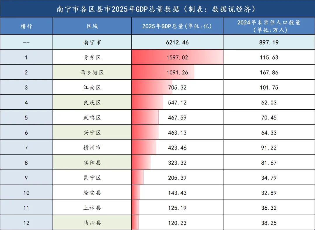 宾阳县和邕宁区2025年GDP总量分别为323.32亿元、205.39亿元,分别排名第八、第九。