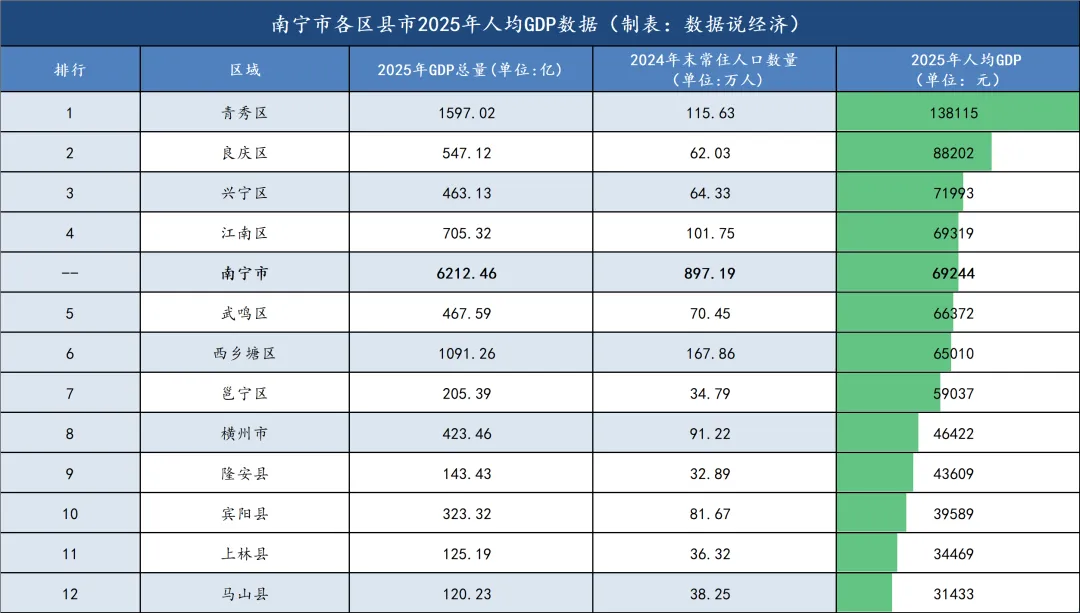 兴宁区和江南区2025年人均GDP分别为71993元、69319元,分别排名第三、第四。
