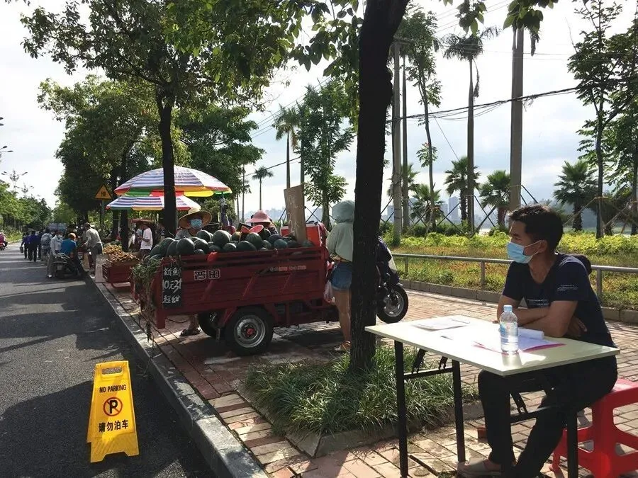 记者发现,现场除了一字排开的流动三轮车摊点外,还有一个登记点。一名工作人员负责测量体温,登记商贩信息等事宜。