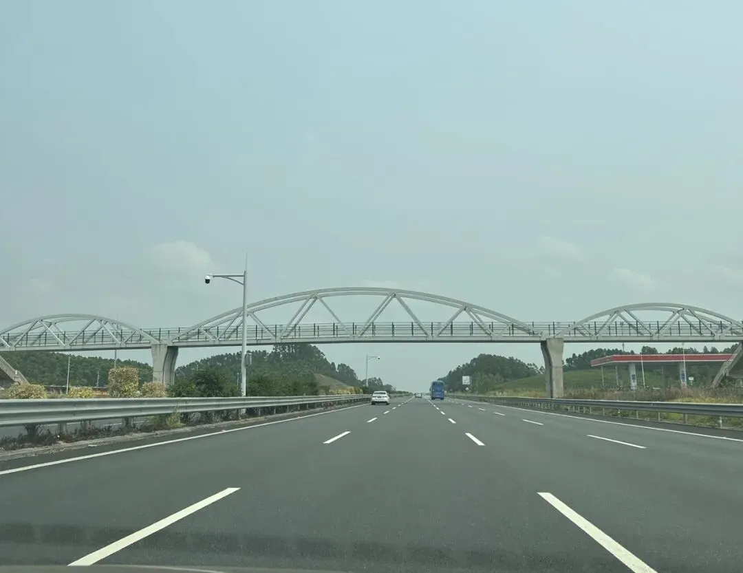 高速上的风景也很治愈,开阔的路面、远处的青山,还有横跨公路的天桥,随手一拍都是自驾的松弛感。
