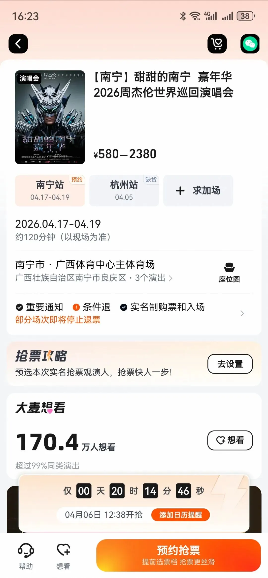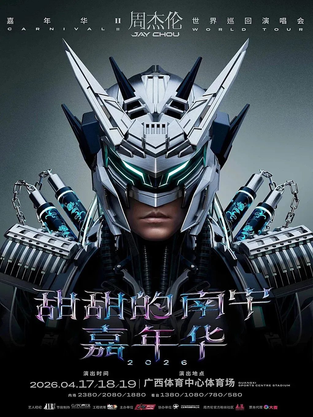 南宁歌迷不用遗憾了!大麦网官宣周杰伦2026「甜甜的南宁 嘉年华」巡演二开,南宁站确认4月17-19日连开三场,场馆广西体育中心主体育场,票价580-2380元,这次终于能稳稳赴约。