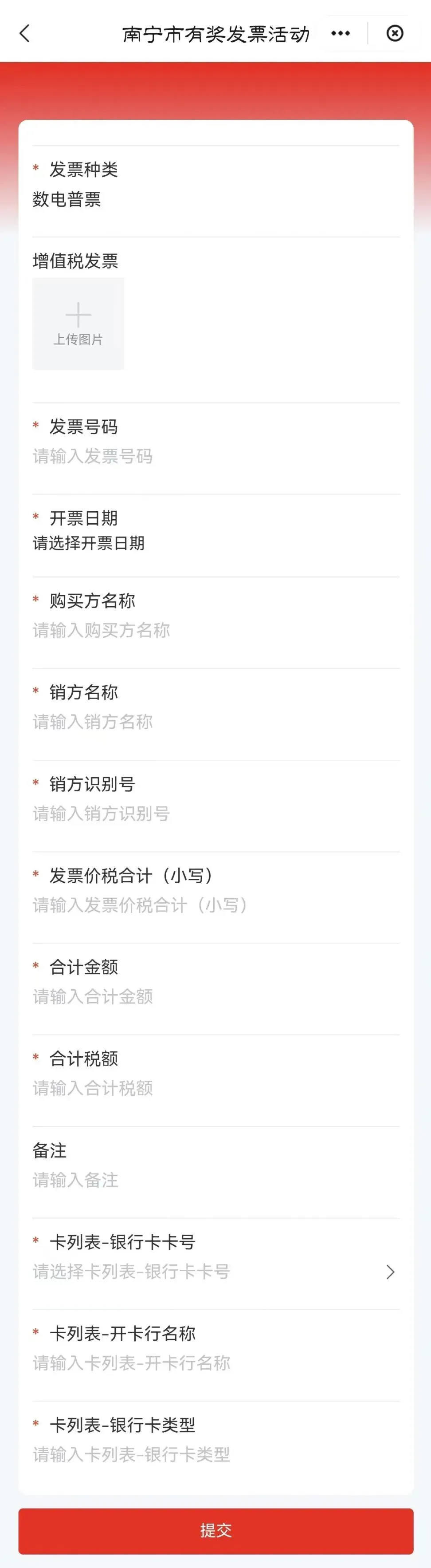 2、根据发票类型选择上传入口→新增,选择拍照/相册上传发票截图/PDF。系统自动识别信息,核对:姓名、金额、开票时间、发票号码无误后,填入收取奖励的银行卡信息,银行卡完成活动授权后提交即可交。