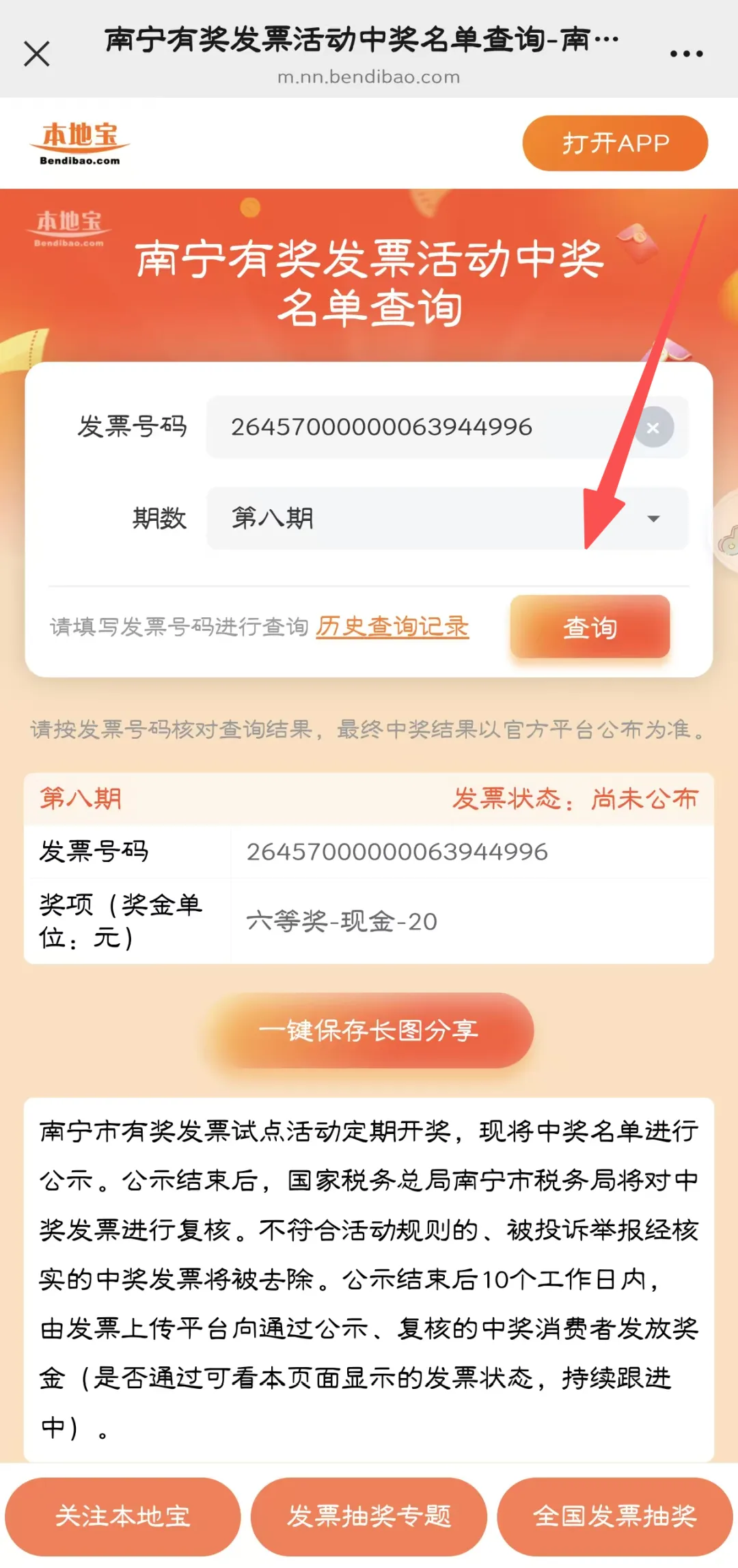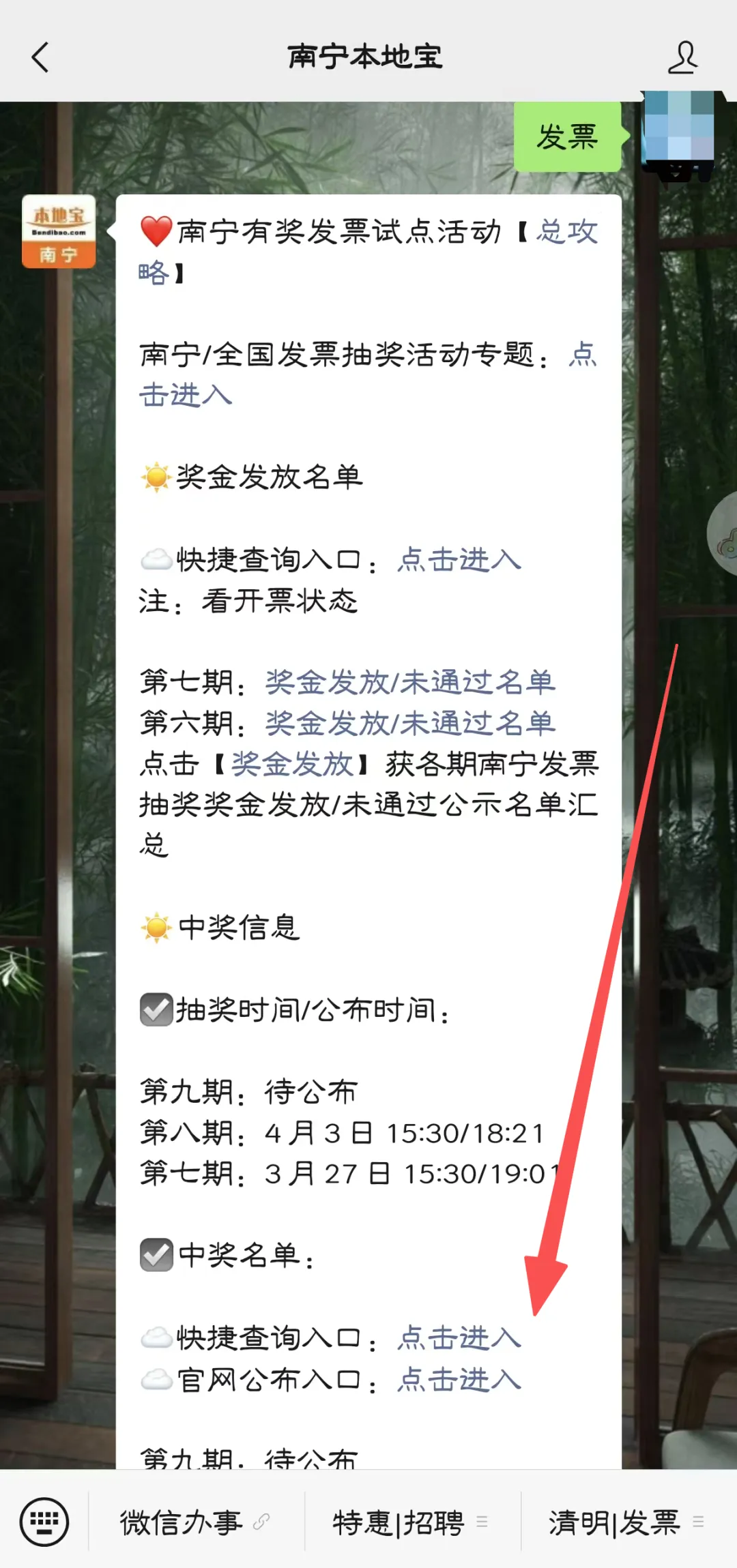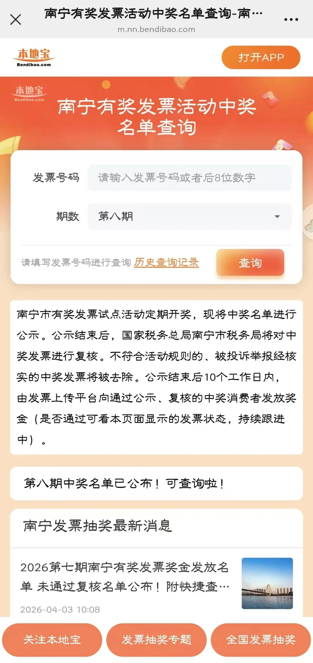 可扫描/长按识别下方二维码,关注【南宁本地宝】微信公众号,在首页对话页面发送【发票】,获南宁有奖发票中奖名单快捷查询入口(输入发票号码即可查询)、名单下载入口、活动入口及操作流程、活动细则/优化细则、热门问题解答等。