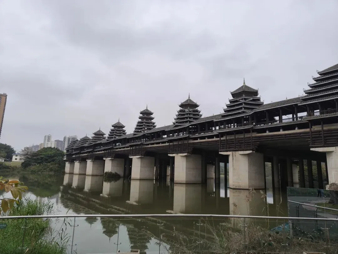 侗族木构建筑错落有致,青瓦飞檐映着湖光山色,