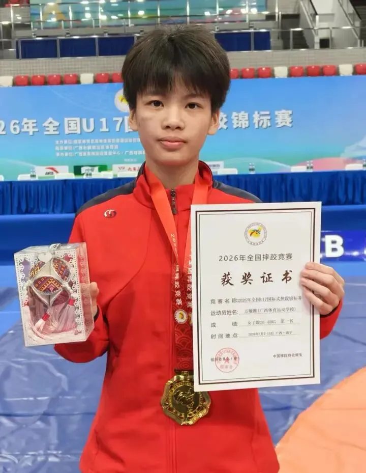 方敏雅在今年3月的比赛中夺冠后展示奖牌和证书。(赛事主办方供图)据悉,方敏雅近期赛场表现突出。3月在广西南宁三塘体育训练比赛基地举行的2026年全国U17国际式摔跤锦标赛中,面对来自全国各地的佼佼者,方敏雅沉着冷静、攻防有序,展示出不俗的竞技状态和发展潜力,一路过关斩将夺得了女子自由式摔跤36—40公斤级冠军,为进入国家青年摔跤队奠定了坚实的基础。
