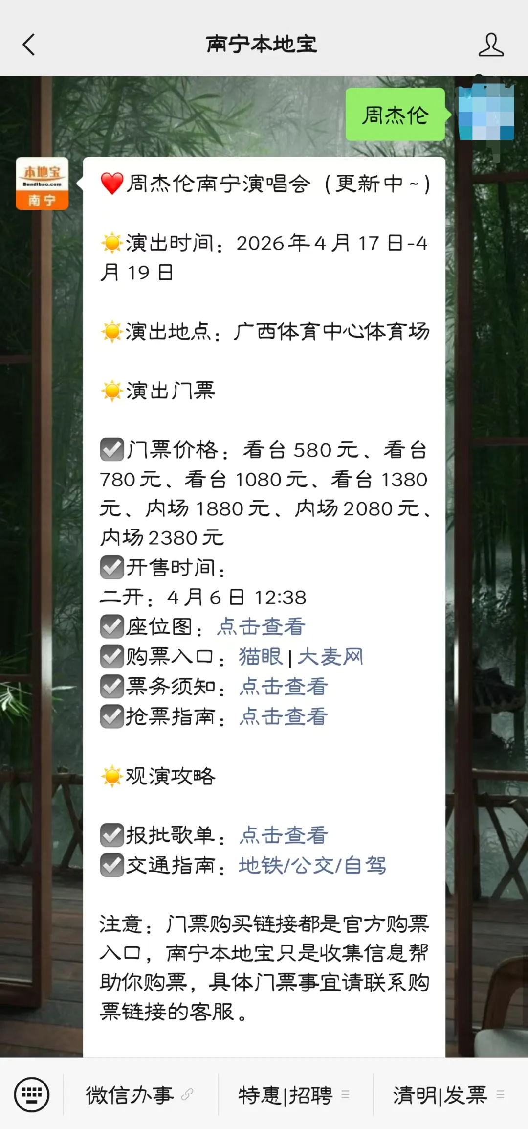 扫描/长按识别下方二维码,关注【南宁本地宝】微信公众号,点击私信进入聊天对话框,回复【周杰伦】,获周杰伦南宁演唱会门票购票入口、抢票攻略、报批演出内容等。