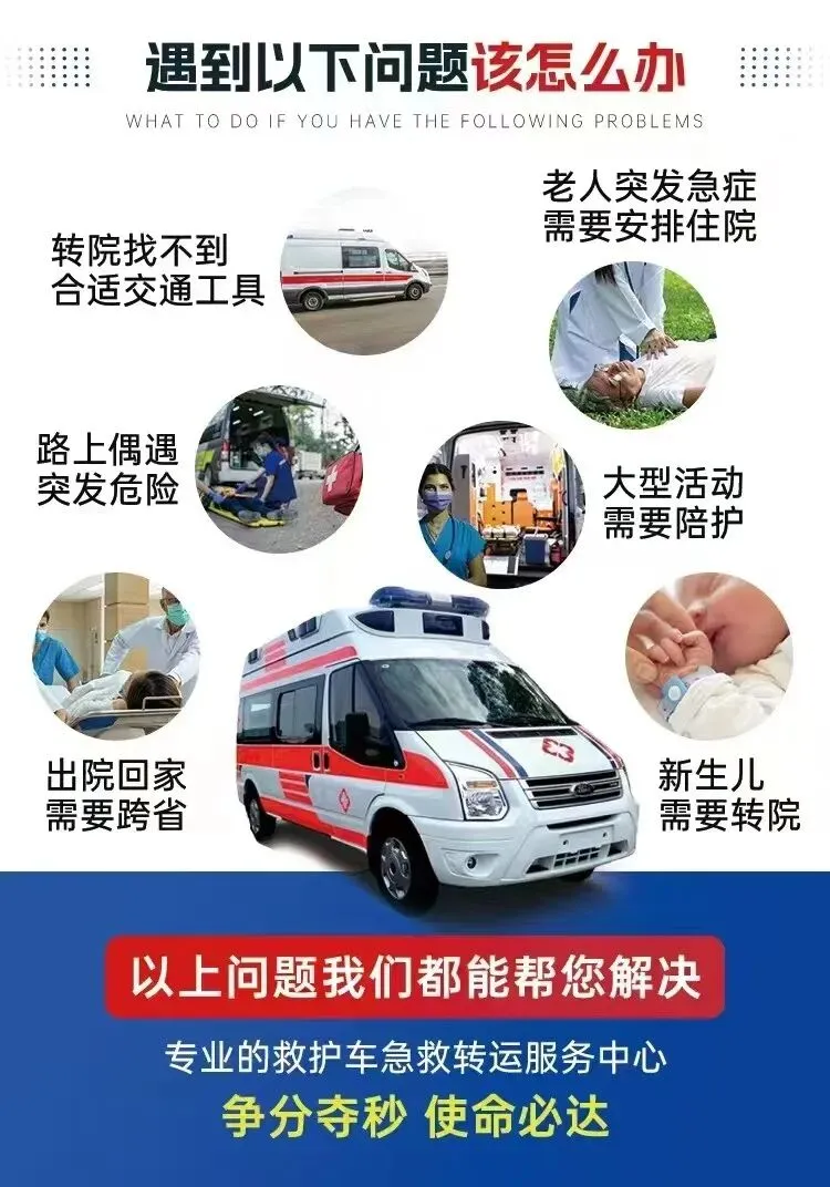 中福救护车出租转运公司,120非急救救护车接送病人预约护送。24小时为术后康复、危重患者及跨区域就医人群提供专业医疗转运服务,提供120救护车出租‖救护车转运‖私人120救护车(非急救)‖跨省长途转运‖危重病人转运‖市内转运‖术后康复病人转运‖高铁病人转运‖患者返乡‖大型活动赛事保障‖配备ICU设备:呼吸机▪心电监护仪▪吸痰器•微量泵•氧气▪急救药箱▪专业医护团队;就近派车