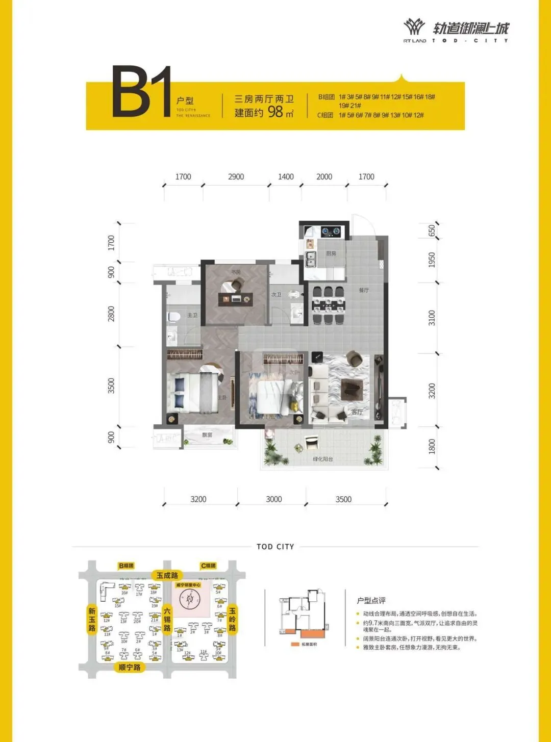 🔹 95-97㎡三房:刚需首选,朝南设计,大阳台全赠送,采光通风俱佳,总价低,上车无压力。