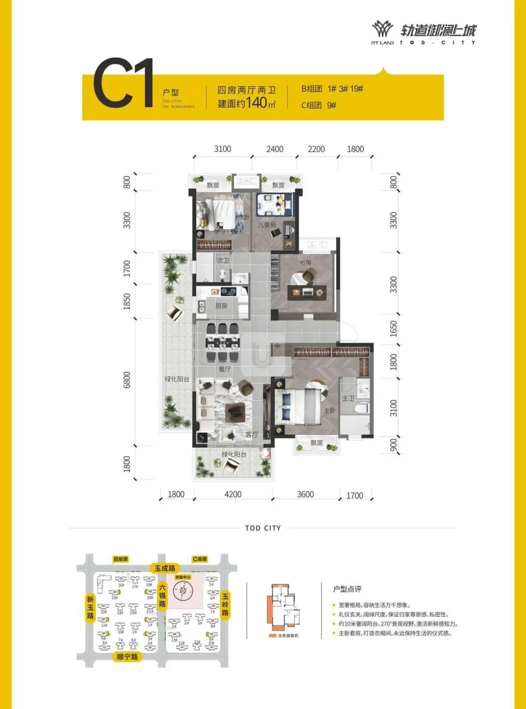 🔹 140㎡四房:高赠送,双阳台设计,主卧套房,阔绰尺度,改善家庭首选。