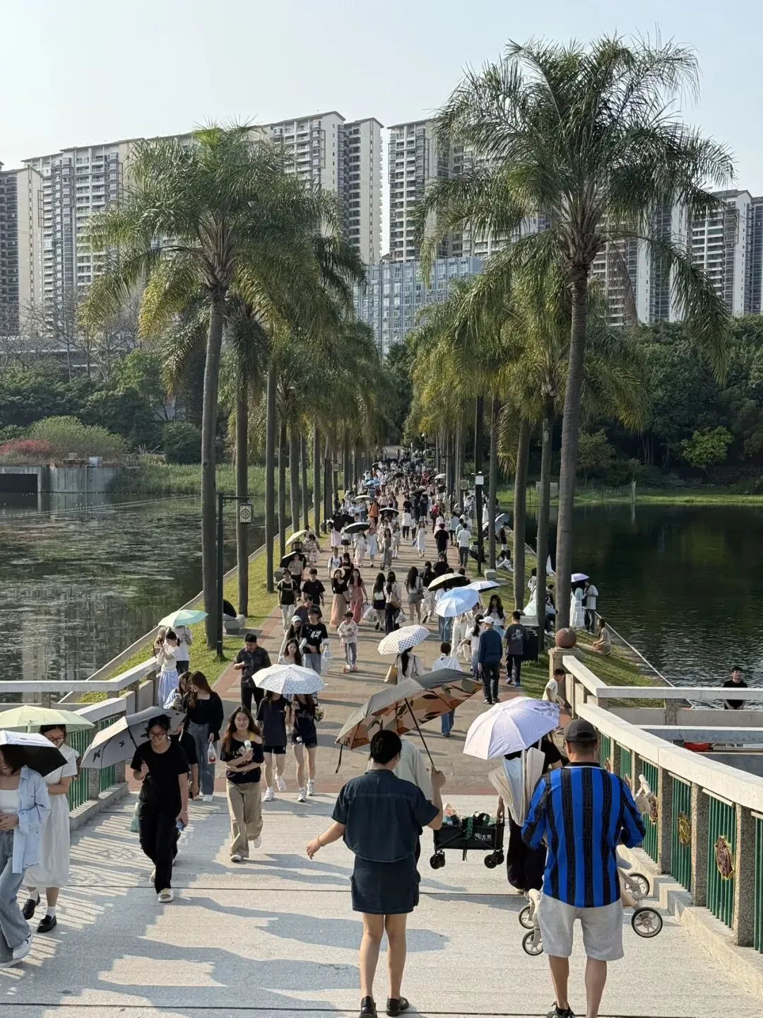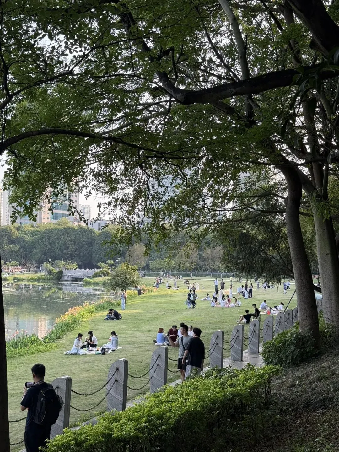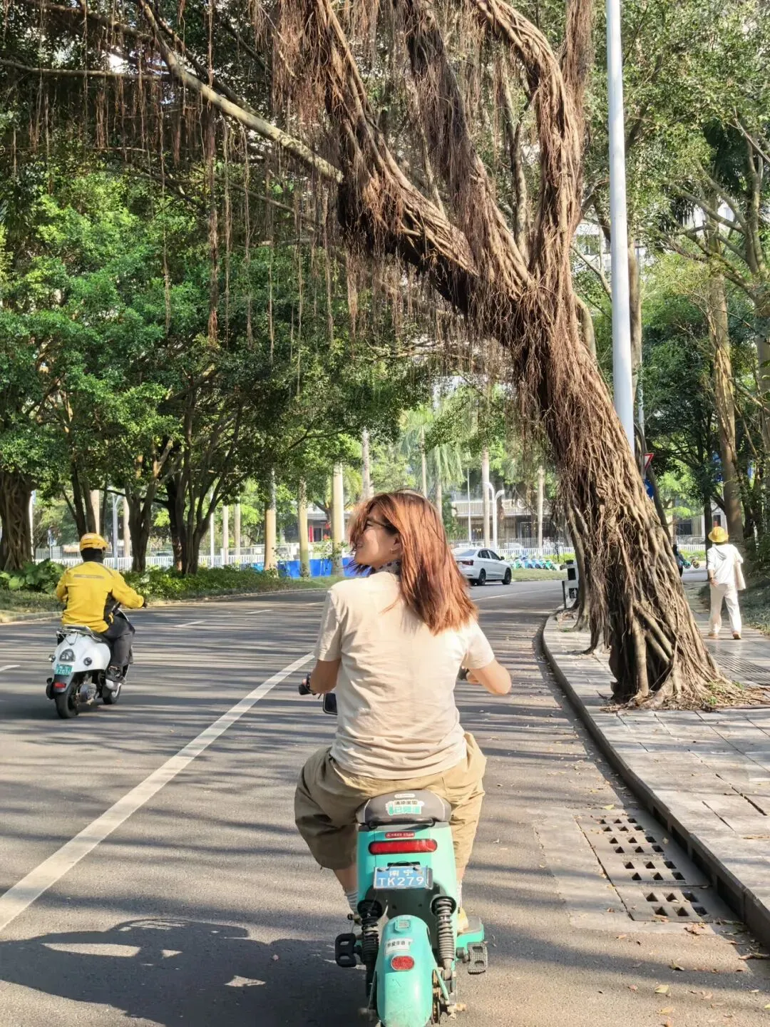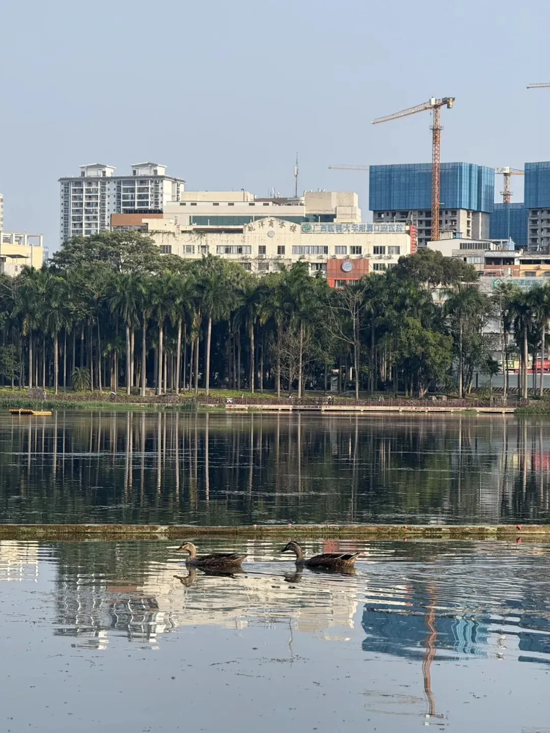 7、在酒店睡饱午觉,在最舒服的四点多出门,骑上共享电动车,在被绿荫环绕下的宽阔的非机动车道上沿湖骑行。南湖公园很大,被周边的城市建筑所围绕,仿佛城市绿洲。中心是一个很大的湖,湖上有南北走向的桥。我过桥的时候是傍晚五点,太阳还烈,如果再晚一些,在这里看日落该是很棒的位置。