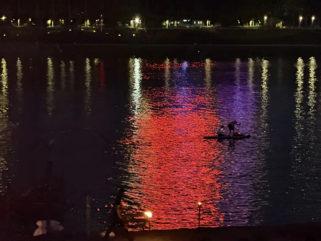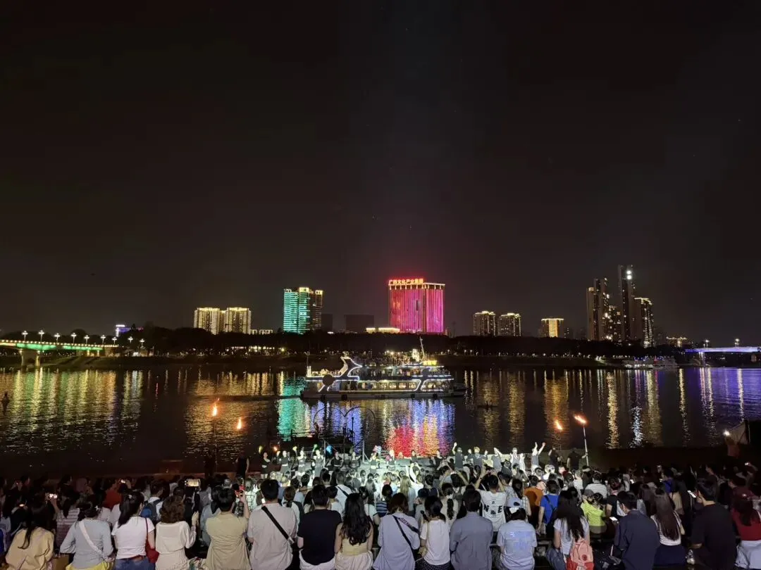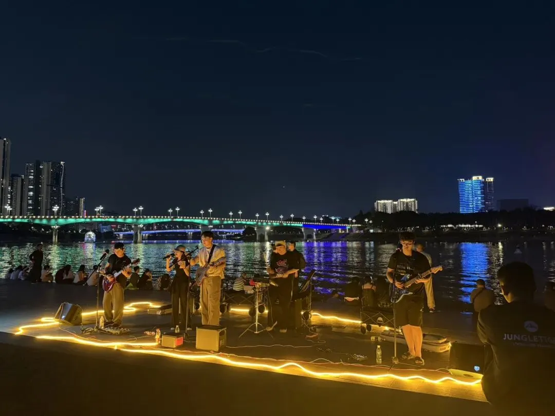 9、邕江旁的乐队,有人在表演,有人在江上划浆板,有人在船上看表演。