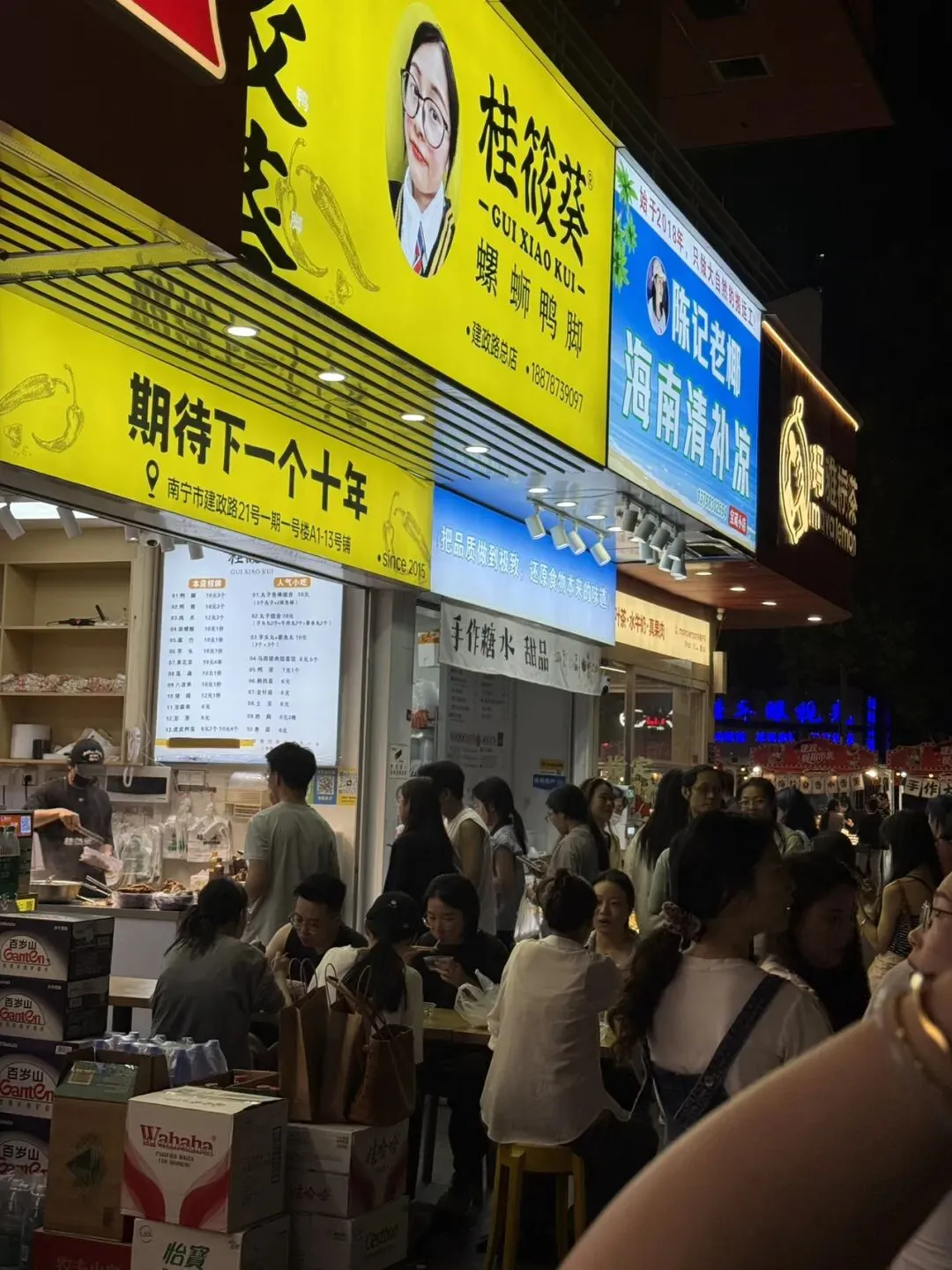 15、我以为建政路夜市的人已经很多了,没想到琅西夜市的人更多。在里面买了个槐花粉,没想到这居然都可以不好喝。买鲜啤和老挝冰咖啡,不经意间走到了旁边的巷子里,发现了夜市一模一样的卖田螺和鸭脚的摊位,不过是两个小孩儿在卖,还有许多看上去非常地道的店面和摆摊。原来这才是本地人的夜市----我拎着刚在夜市买的卷筒粉得出的答案。