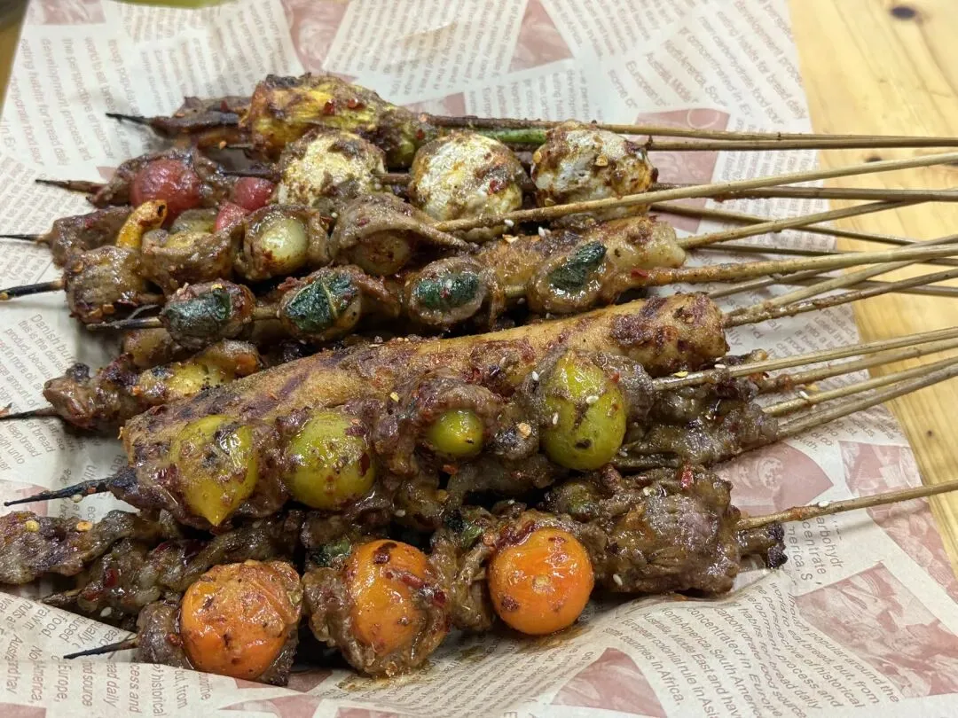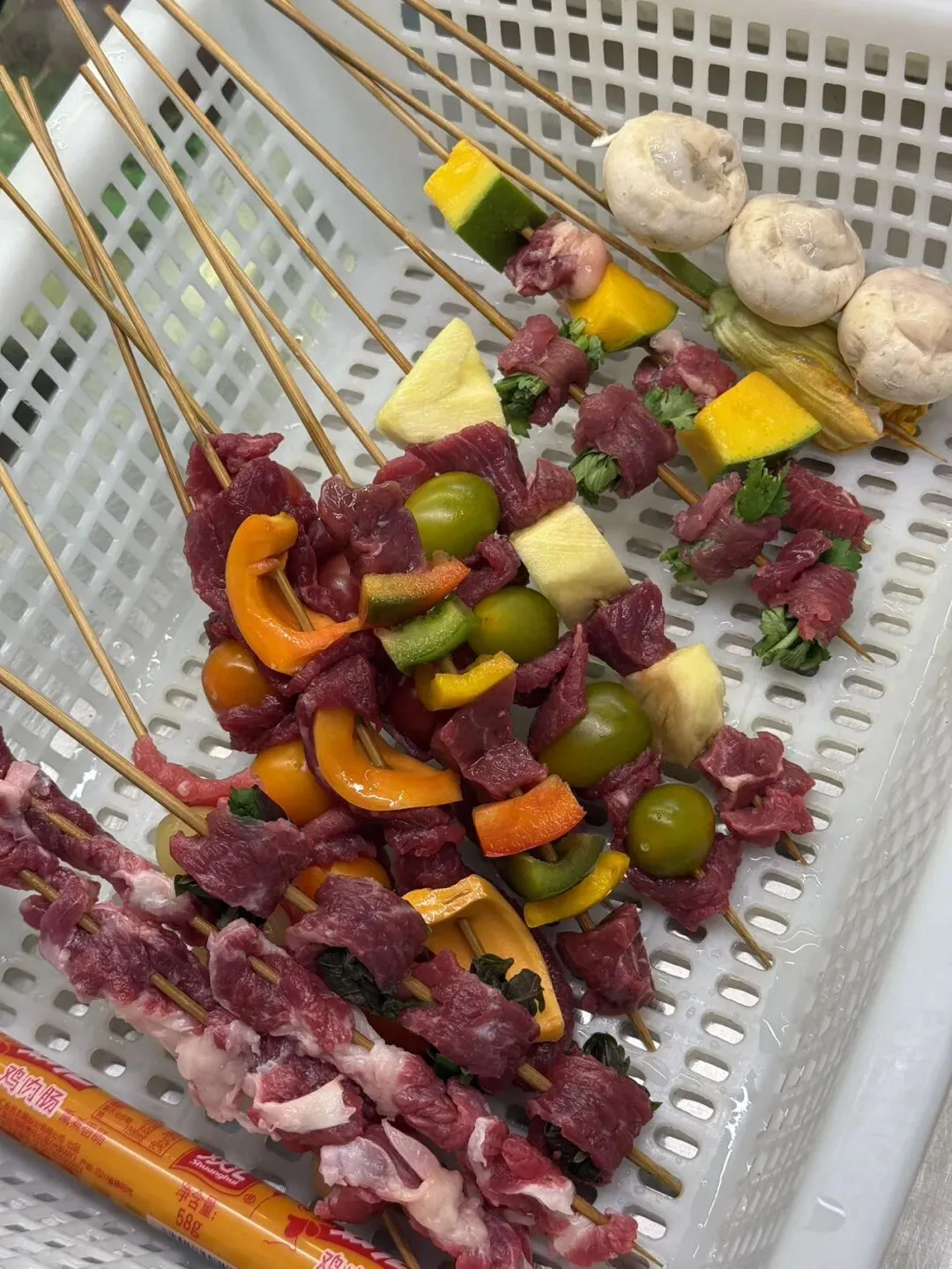 13、果酱烧烤,南宁之旅目标美食之一。水果+肉的搭配让人眼前一亮,加上果酱的风味,口感是咸、甜、酸,不过对于我来说有点太咸了,并且不同水果的烧烤串风味相差有点大,但我非常非常喜欢吃南瓜花酿肉(还是南瓜花虾滑?)、口蘑虾滑,超好吃!还有菠萝蜜+牛肉的这个烧烤搭配,也非常好吃。