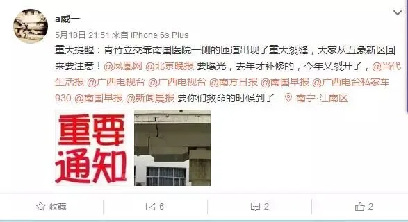 报君说:今晚,南宁青竹立交出现大裂缝的消息刷屏了南宁人的朋友圈,引起了极大的关注。不少人私信早报君,问:到底是怎么回事?