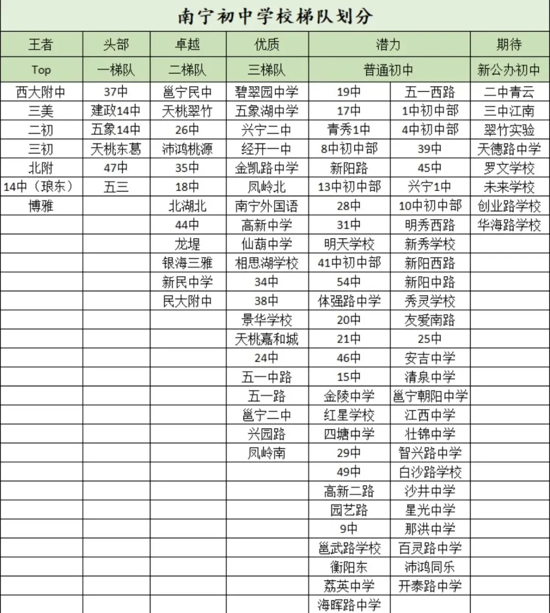 根据家长们分享的这份梯队图,南宁初中被划分为:王者(Top)、头部(一梯队)、卓越(二梯队)、优质(三梯队)、潜力(普通)及期待(新办)。