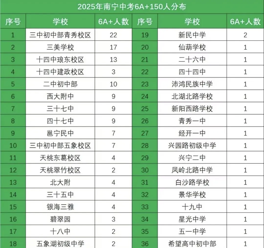 从“2025年南宁中考6A+分布”来看,三中初中部青秀校区以22人的傲人成绩领跑全市。紧随其后的是三美学校(17人)和14中琅东校区(13人)。这说明这些学校在培养顶尖学生方面具有极强的压舱石作用。