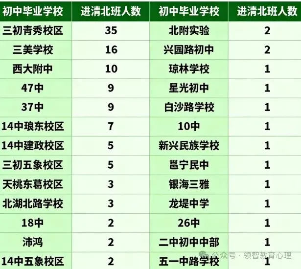 强势依然:三初青秀校区(35人)、三美(16人)、西大附中(10人)占据了前三甲。这进一步佐证了它们在“王者梯队”的地位。