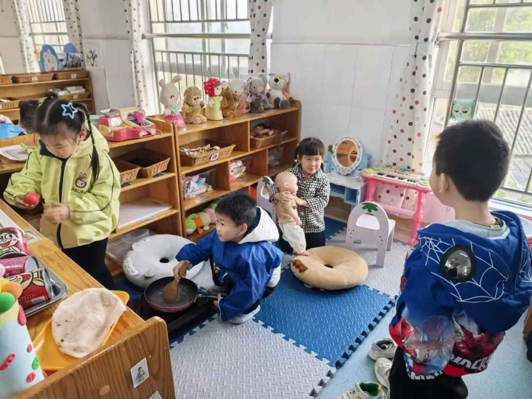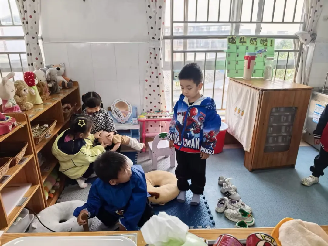濠濠探进头:“我能来你们家做客吗?过年我都去做客的。”悦悦立刻说:“可以呀,你进来吧。”濠濠走进娃娃家,站在客厅中间观望,不知该做什么。没有人主动招呼他。
