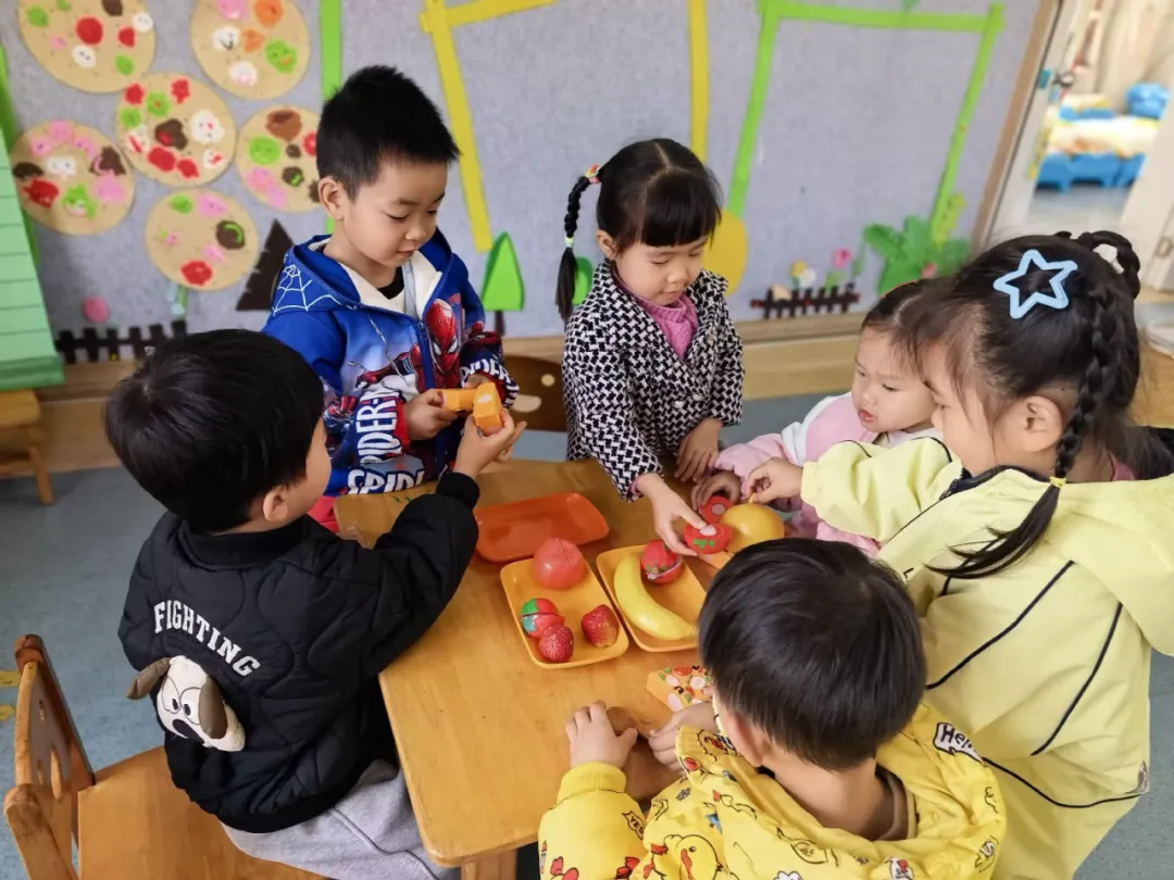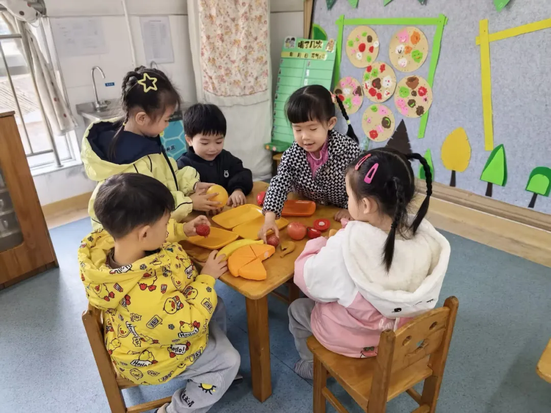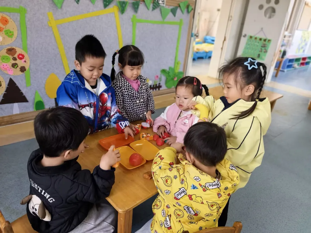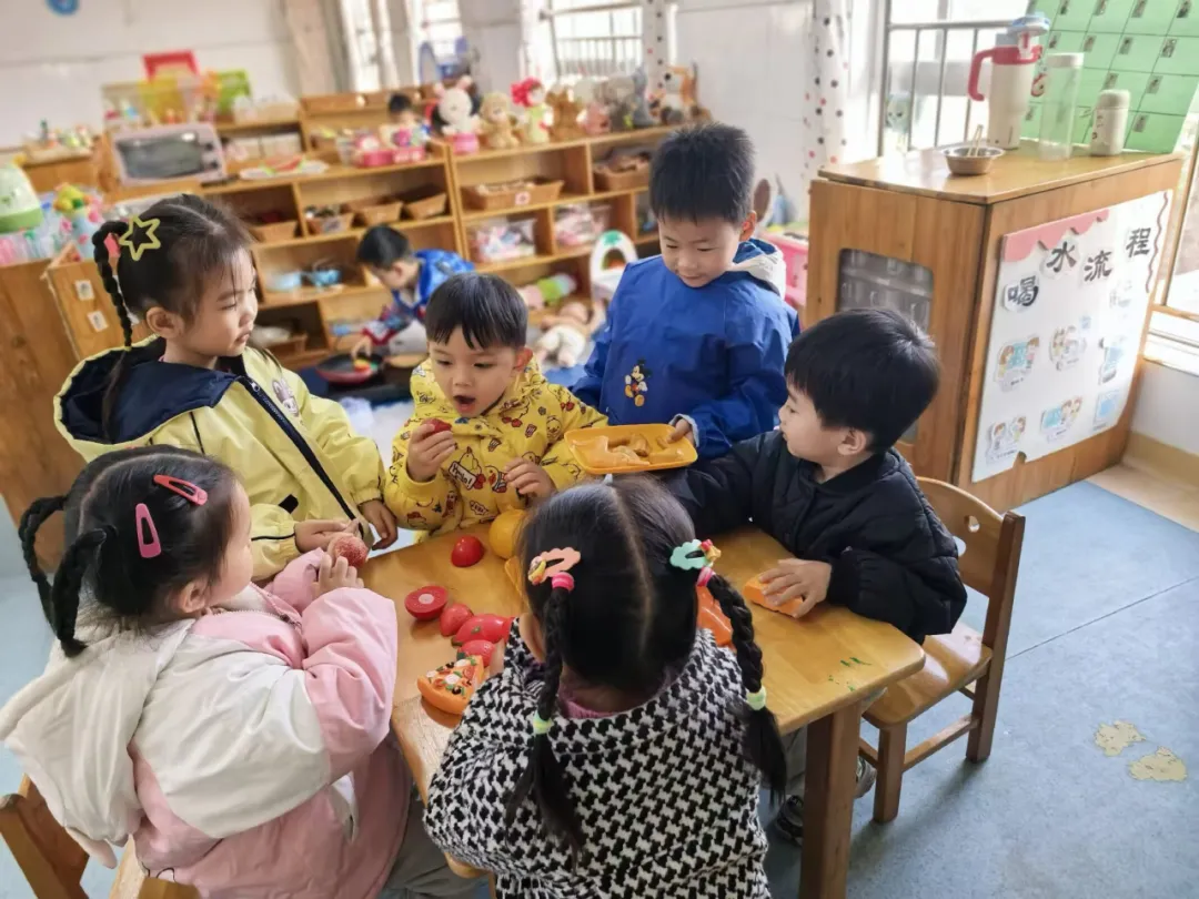 悦悦一直站在旁边,较少参与,表情有些孤单。教师低声提示:“悦悦可以做什么呢?过年做客,小主人会不会拿水果给客人吃呀?”悦悦眼睛一亮,拿起水果模型递给客人:“客人,给你们吃水果。”诚城说:“谢谢姐姐!”悦悦大声回答:“不客气。”脸上露出开心表情。