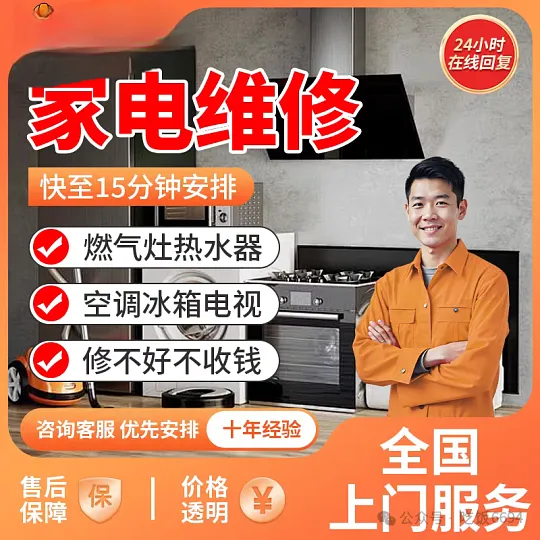 空调、燃气灶、热水器、洗衣机、冰箱、油烟机等各类家电问题,一站式解决!专业维修冰箱、空调、热水器、油烟机、燃气灶、洗衣机等大型家电。资深技师持证上岗,快速诊断不制冷、不制热、异响、漏水等故障,提供原厂配件更换,维修后享有质保。支持上门检测,同城24小时响应,老旧机型也可检修。透明报价无隐形收费,提供清洗保养一体化服务,让家电重焕高效运行,守护家居生活品质。