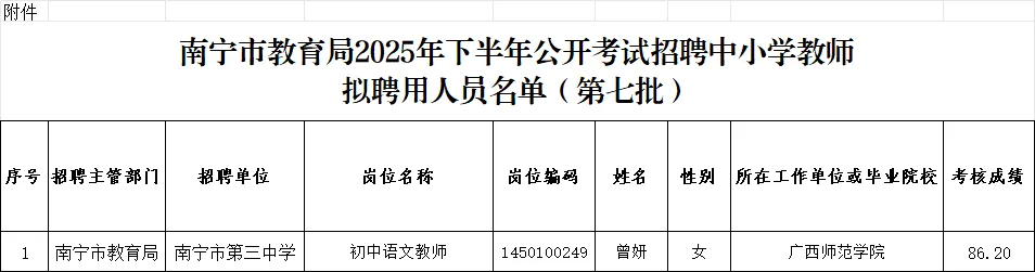 附件:南宁市教育局2025年下半年公开考试招聘中小学教师拟聘用人员名单(第七批)