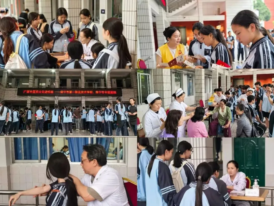 南宁市中医医院组织宣传科、产业办、新华内科、新华外科骨伤科、脑病科一病区医护团队走进南宁市第一职业技术学校,开展中医药文化进校园活动。现场为师生提供体质辨识、健康咨询,护理团队开展耳穴埋豆、铜砭刮痧等特色中医体验,并同步开展中医药健康文化素养宣教。