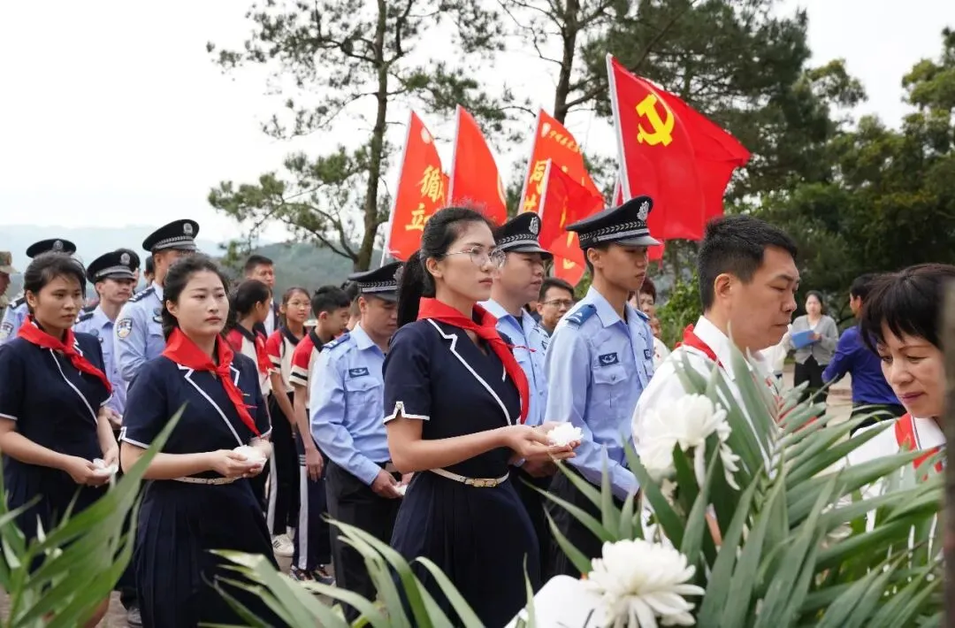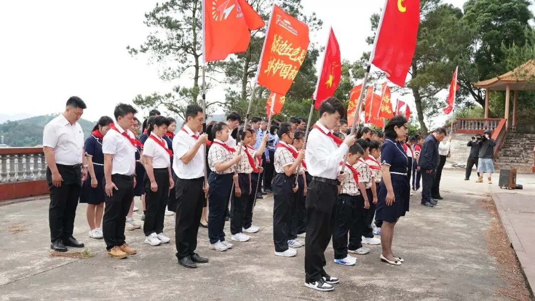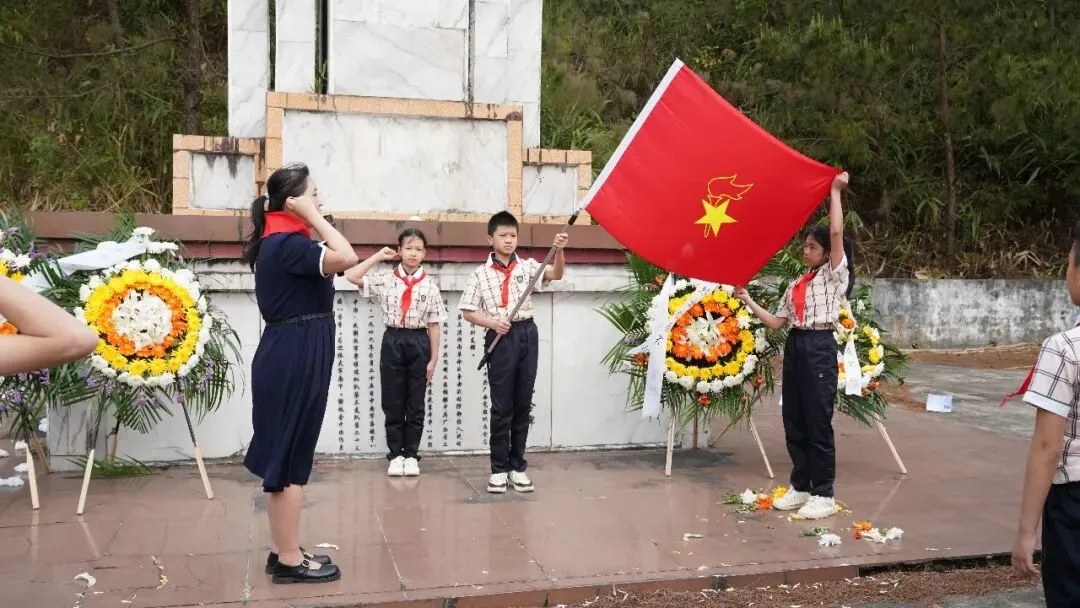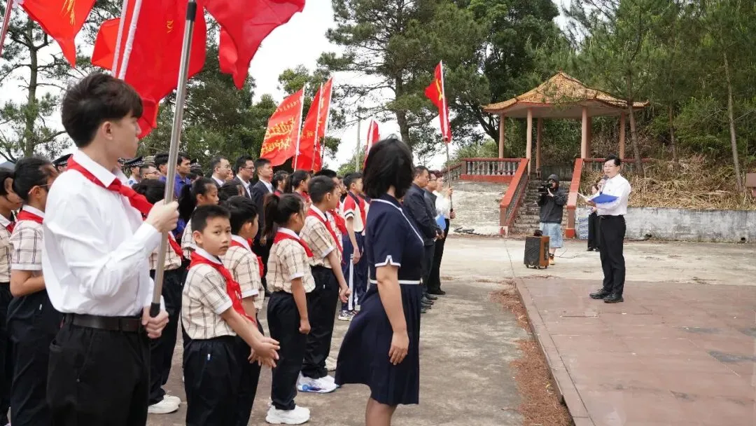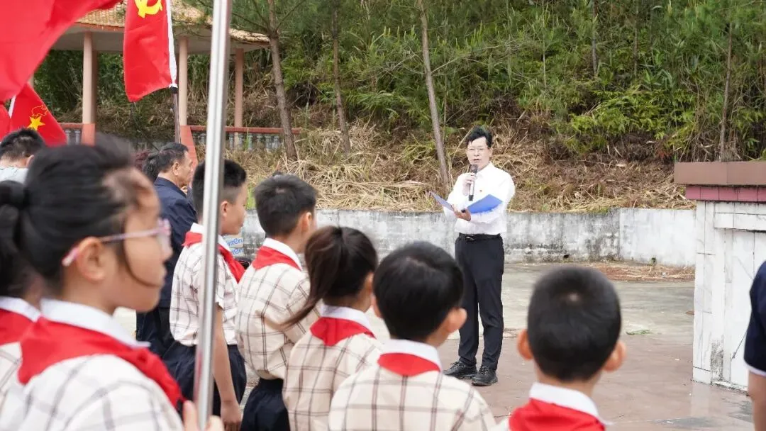 上午9时,祭奠仪式正式开始。首先,南宁师范大学教师教育副院长陶源泉同志发言,他从教育者的视角勉励少先队员“从边关读懂中国,从英烈身上汲取信仰力量”;接着,宁明县教育党工委组织委员农杰武同志讲述爱店作为红色国门的历史使命;随后,爱店边境派出所副所长孔祥斐同志以一线守边人的身份诠释“国土寸步不让”。