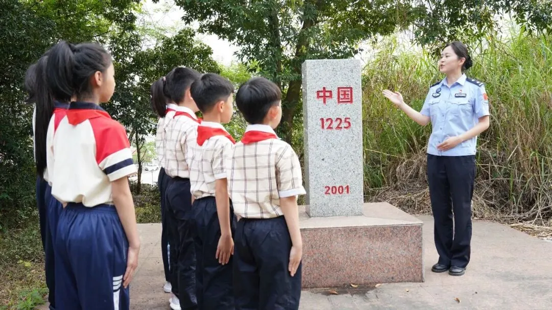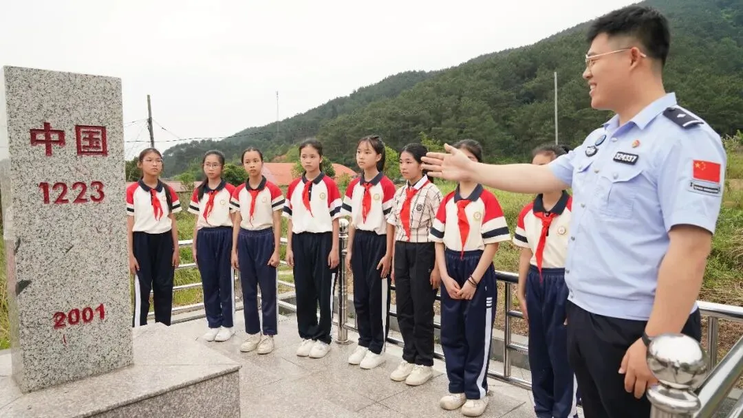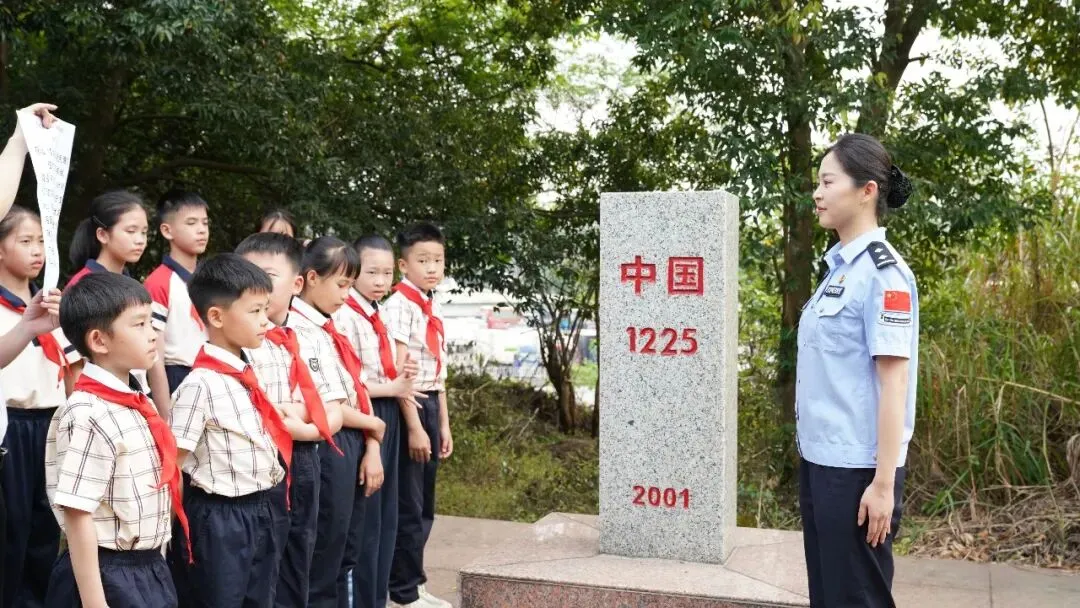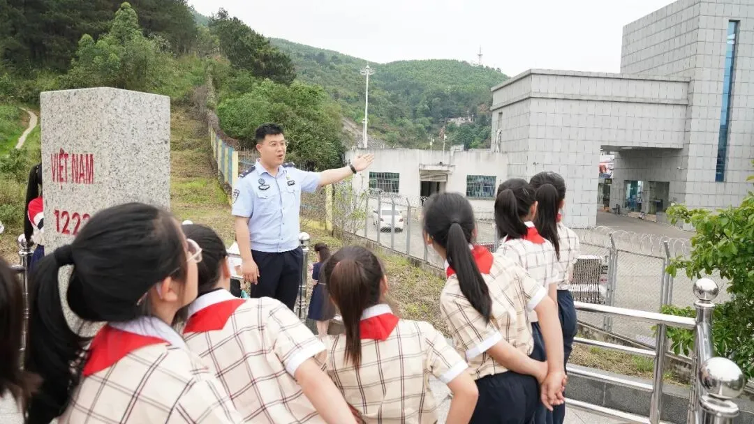 4月1日下午,队伍转赴爱店口岸。在1223号、1225号界碑前,爱店边检站民警现场讲授了一堂“国门微党课”。他指着界碑上鲜红的“中国”二字说,这块界碑代表着国家的主权,一步不能退。少先队员们围在界碑旁,伸出小手轻轻触摸碑身。随后,全体队员在国门前庄严宣誓:“守土有责,强国有我!”稚嫩的声音在口岸上空汇聚成一股不可撼动的力量。