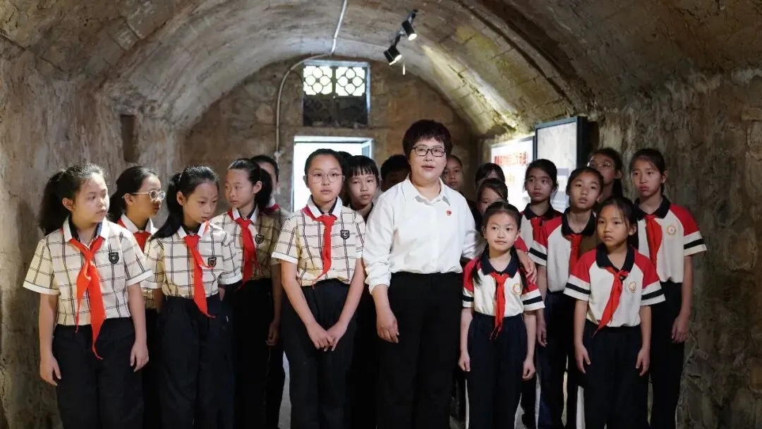 随后,队伍走进那逢屯防空洞。洞内幽深狭长,墙壁上还保留着当年的痕迹。爱店镇中心小学党支部书记覃焦密同志为两校少先队员上了一堂特殊的思政课。她借助洞内昏暗的灯光,声音沉稳而有力:“同学们,你们脚下的每一寸土地,都曾有人用生命去守护。这条地道,就是边关人民不屈精神的缩影。今天,我们在这里上课,就是要记住:爱国不是空洞的词,而是像那逢的先辈一样,在危难时刻人人挺身而出。”洞内回声阵阵,孩子们屏息聆听,仿佛穿越回了那段烽火岁月。