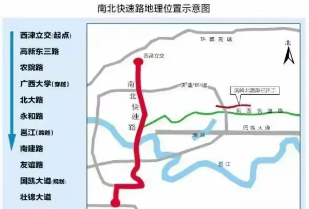 南北快速路并非全新规划,早在2013年就已完成规划审批,最初北段线路计划沿发展大道、农院路直接穿越广西大学校区,接入秀厢大道行建立交。但由于穿越校园会割裂校区空间、影响教学与生活秩序,加之征地拆迁难度大、多方协调成本过高,项目此后长期处于停滞状态,前后耗时长达13年。此次规划优化,是结合实际情况做出的务实调整,既保证快速路功能实现,也兼顾周边区域现状,让长期悬而未决的项目具备实施条件。