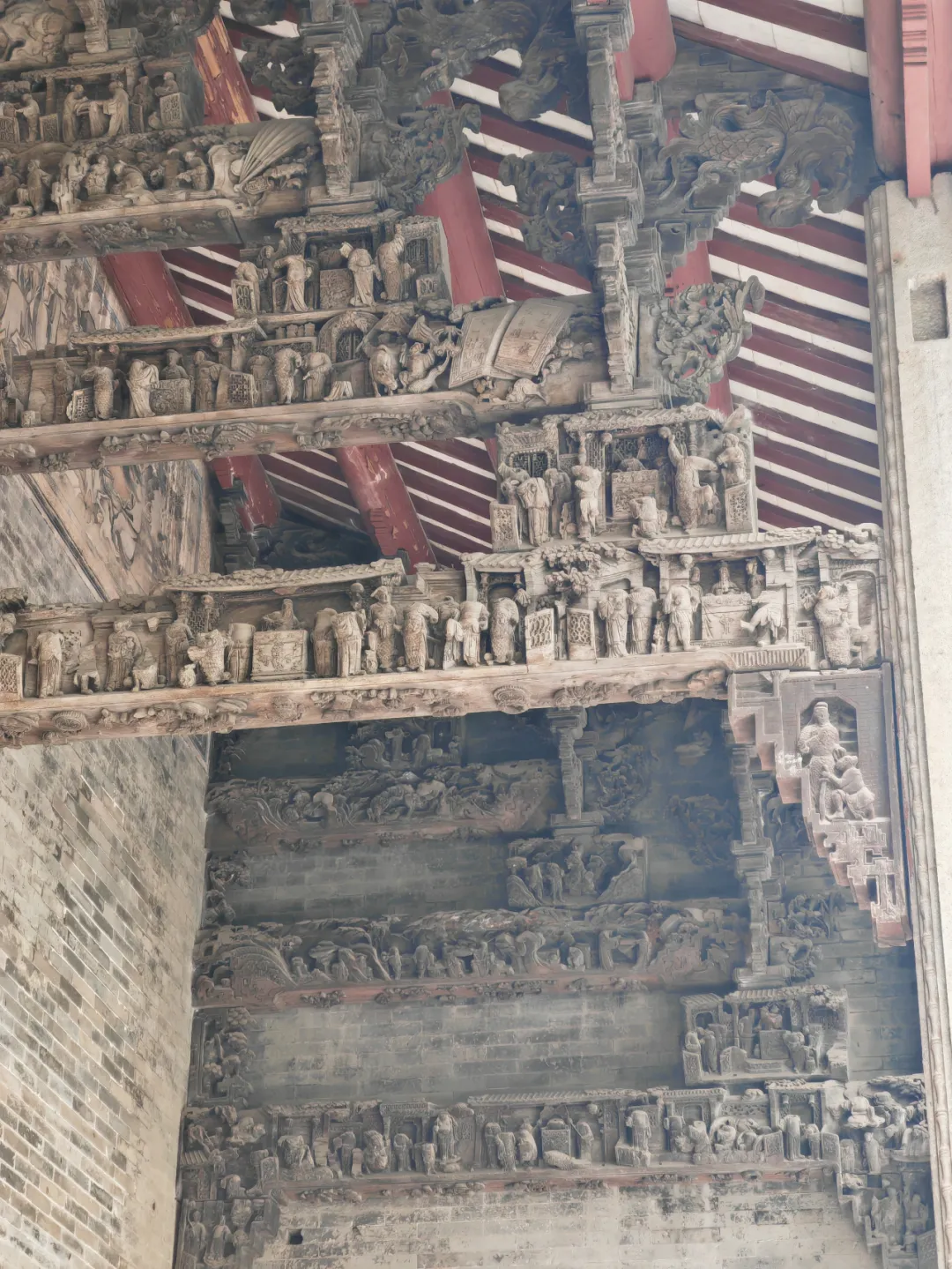 屋脊之下,梁架之间,尽展岭南木雕的绝妙技艺。工艺繁复精美,多取材于《金殿逼婚》《九焰山》《界牌关》《八仙祝寿》等戏剧故事,刀笔之间,情节流转,值得细细品味。
