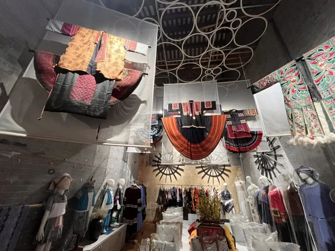 馆中陈列着服饰、摆件、围巾、手袋、帽子等琳琅满目的壮锦制品,既可观赏,亦可选购。