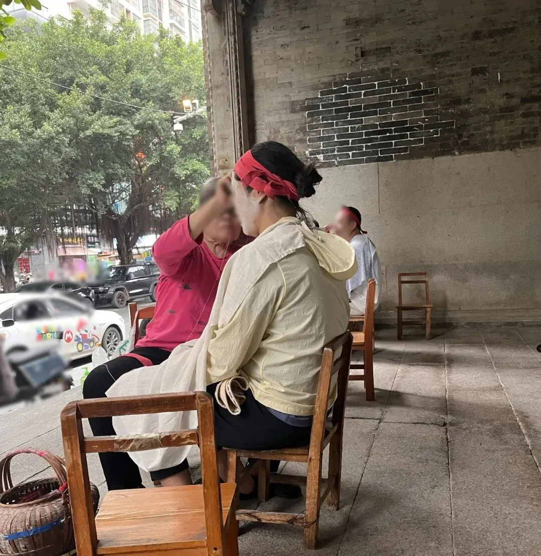 一位阿婆家住附近,常拎着小凳子,坐在粤东会馆的门楼前,为来往客人绞面。
