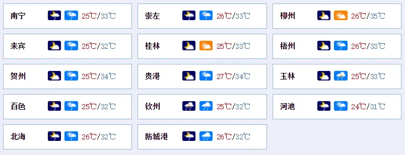 南宁 多云有阵雨或雷雨,局地中雨到大雨 25-33℃
