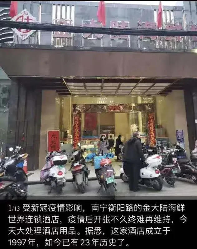 近日,南宁金大陆海鲜世界衡阳店(以下简称“金大陆衡阳店”)大规模“甩卖”餐厨用品。有传言称,受疫情影响,该店难再维持。此消息在一些南宁人的微信群流传。