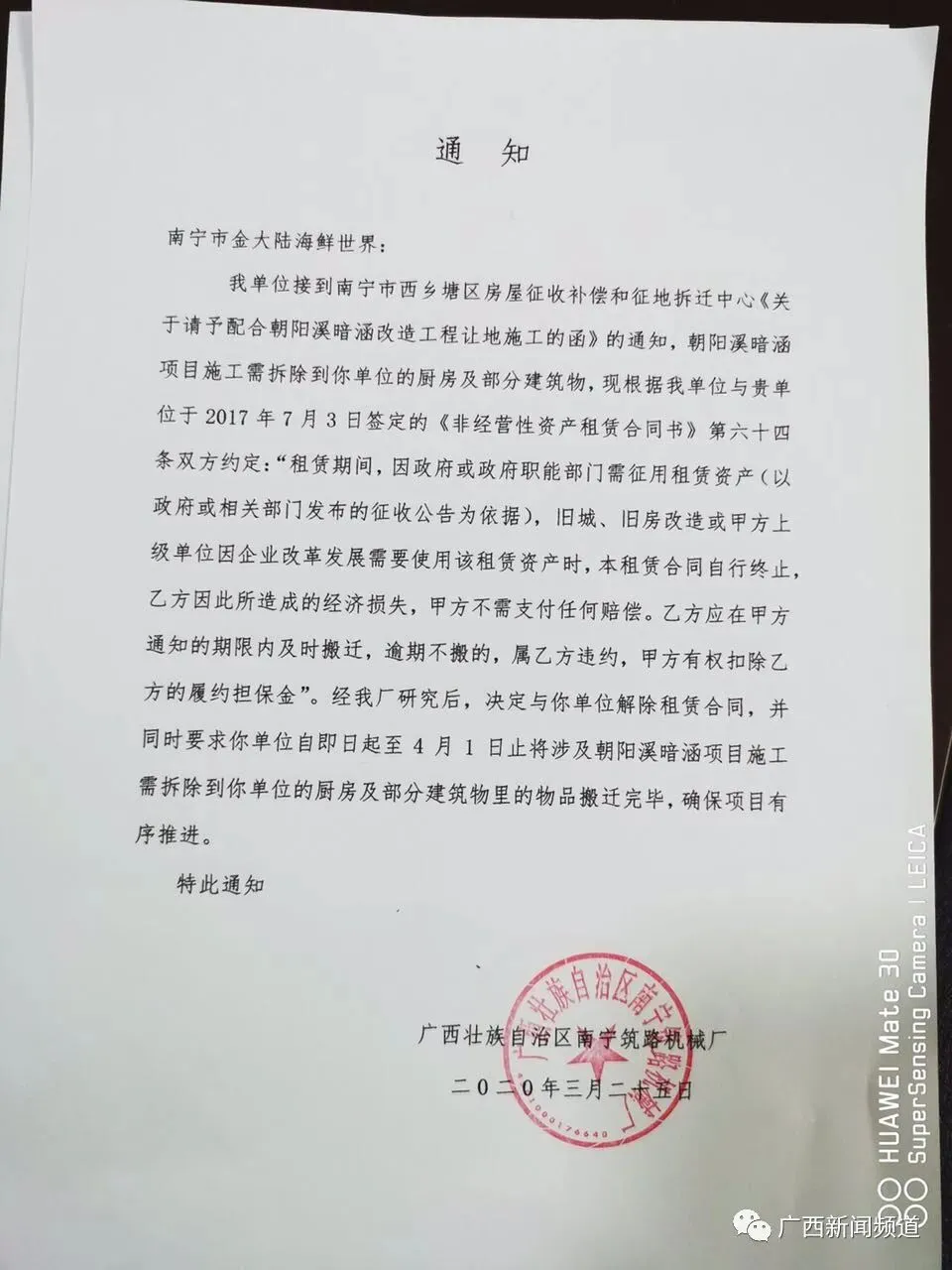 原来,3月25日,金大陆衡阳店收到门店租赁方的通知称,因南宁市朝阳溪暗涵改造工程项目施工需拆除到门店的厨房及部分建筑物,因此决定与门店解除租赁合同,并要求他们在4月1日前将相关物品搬迁完毕。