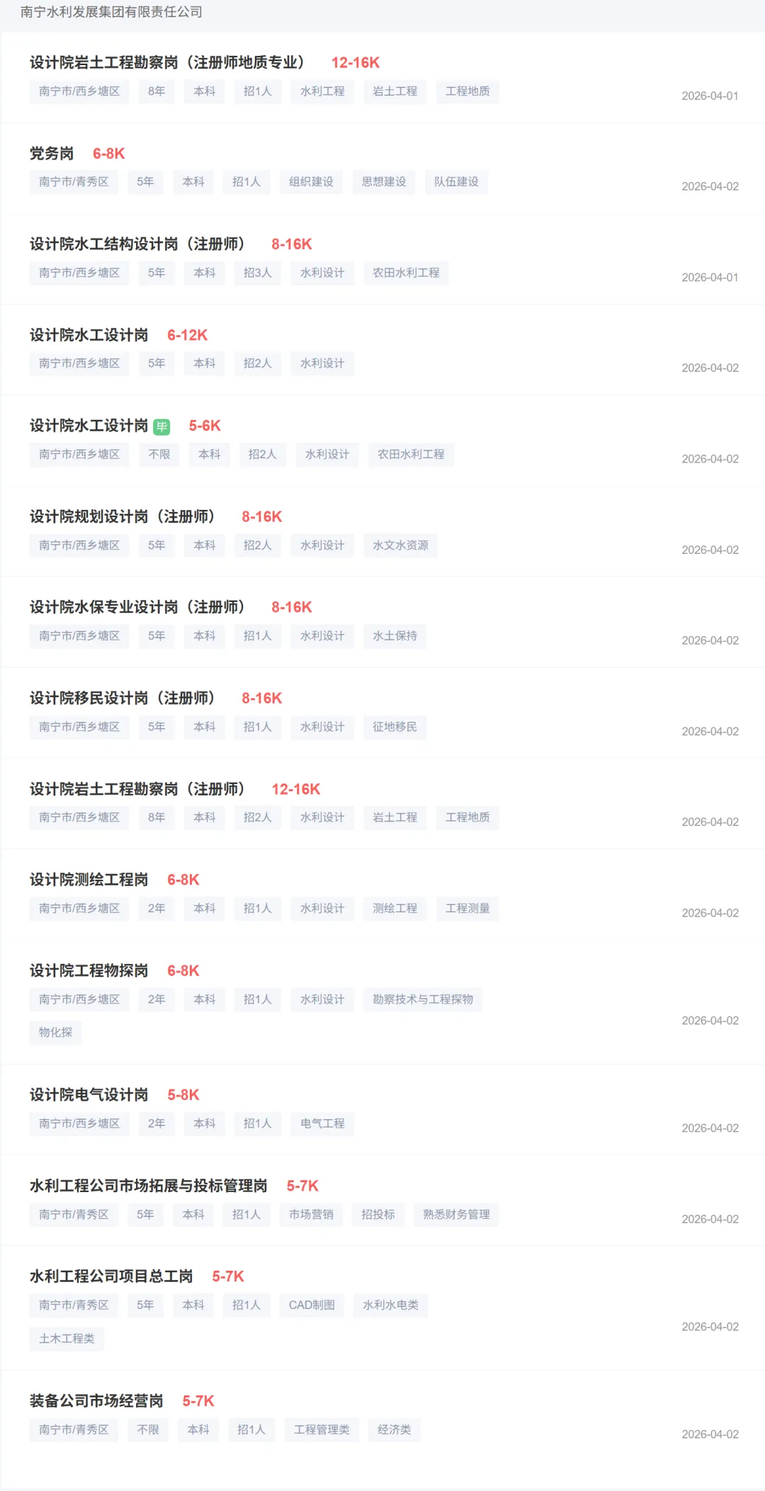 南宁水利发展集团有限责任公司是南宁乡村振兴集团有限责任公司全资子企业,主要业务为水利水电、灌区工程、公益性农村人饮工程及乡村振兴基础设施的投资、设计、施工、运营等,是南宁市城乡生态基础设施设计、投资建设、运营管理平台。公司目前共有员工256人,其中正高级职称2人,副高级职称93人,中初级114人;公司本部设有党政办公室、企管人力部、资产安监部、财务部、市场开发部、工程管理部等6个部门;下设广西南宁水利电力设计院有限公司、南宁水发装备有限责任公司、南宁水发水利工程有限公司等3家子公司。