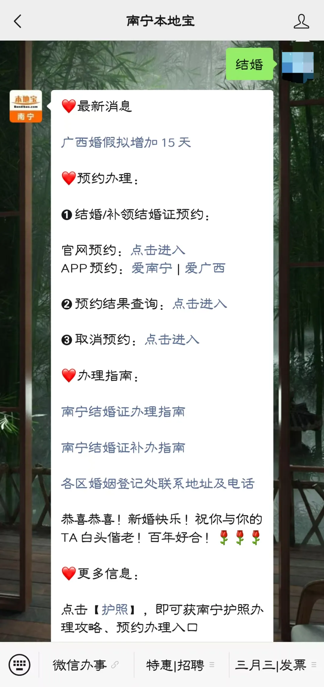 关注【南宁本地宝】公众号,在对话框回复【结婚】,获取南宁结婚攻略+预约入口+婚假规定。