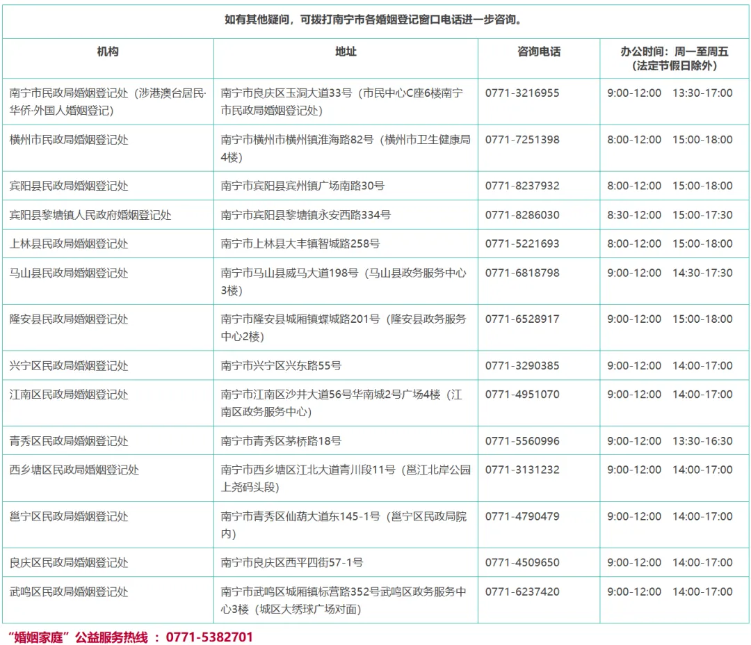 为进一步优化婚姻登记服务,满足群众在节假日期间办理结婚登记的需求,2026年广西三月三(4月19日)当天,南宁市部分县(市、区)民政局婚姻登记处开放办理内地居民结婚登记业务。