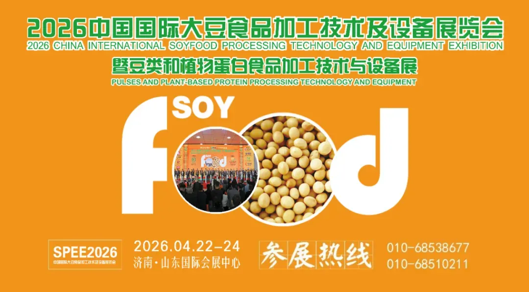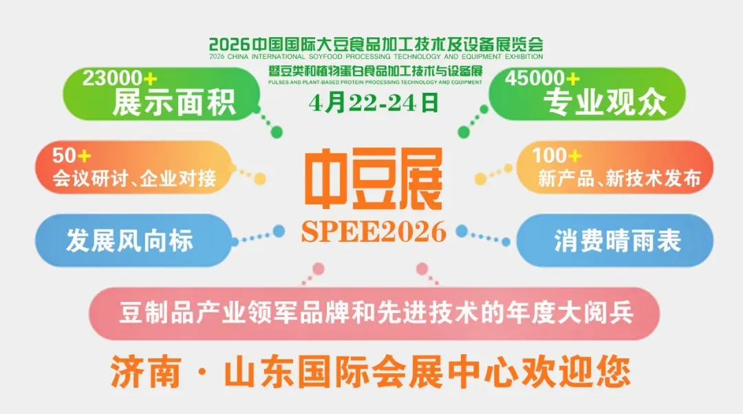 为进一步深化行业交流合作,共享市场变革新机遇,2026年中国国际大豆食品加工技术及设备展览会(中豆展SPEE2026)定于2026年4月22日-24日在济南·山东国际会展中心隆重召开。诚邀业界同仁共襄盛举,携手为保障国家粮食安全和全民健康贡献智慧与力量!