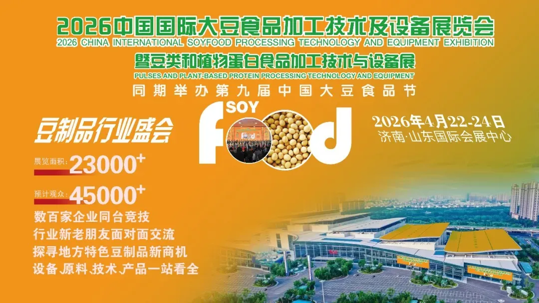 为进一步深化行业交流合作,共享市场变革新机遇,2026年中国国际大豆食品加工技术及设备展览会(中豆展SPEE2026)定于2026年4月22日-24日在济南·山东国际会展中心隆重召开。诚邀业界同仁共襄盛举,携手为保障国家粮食安全和全民健康贡献智慧与力量!